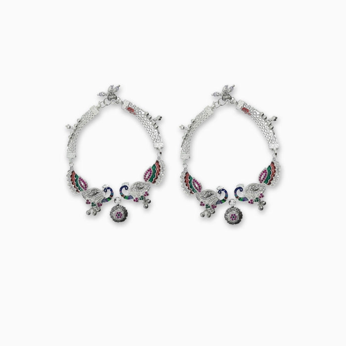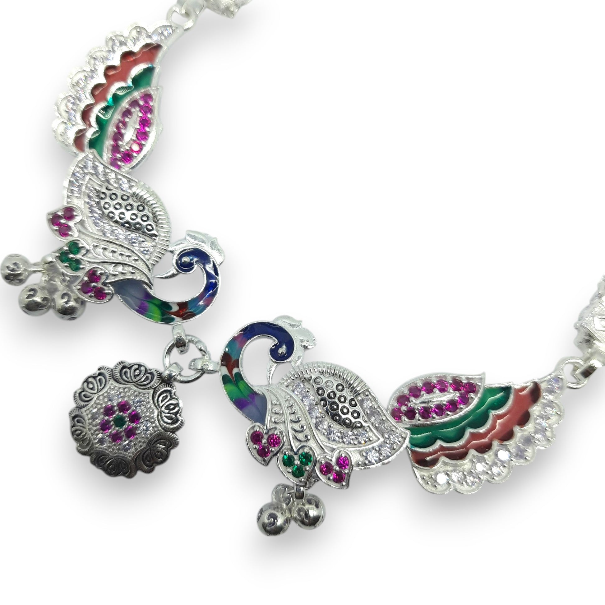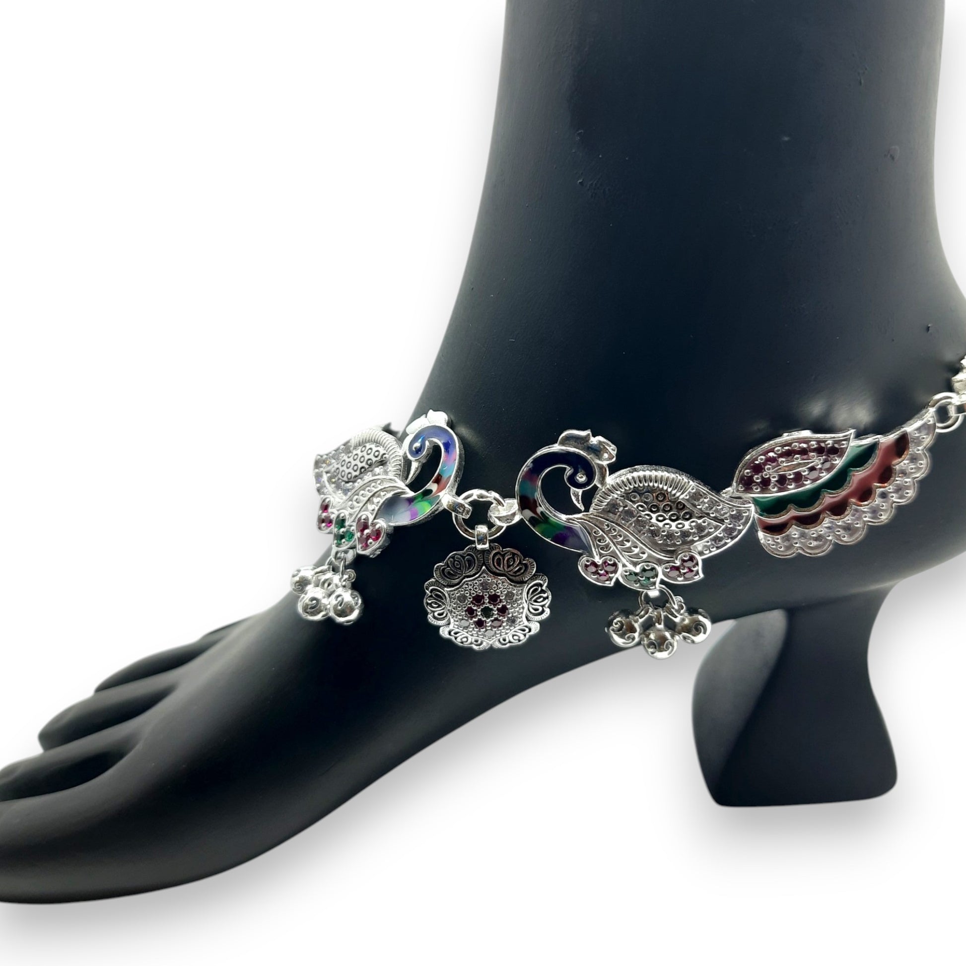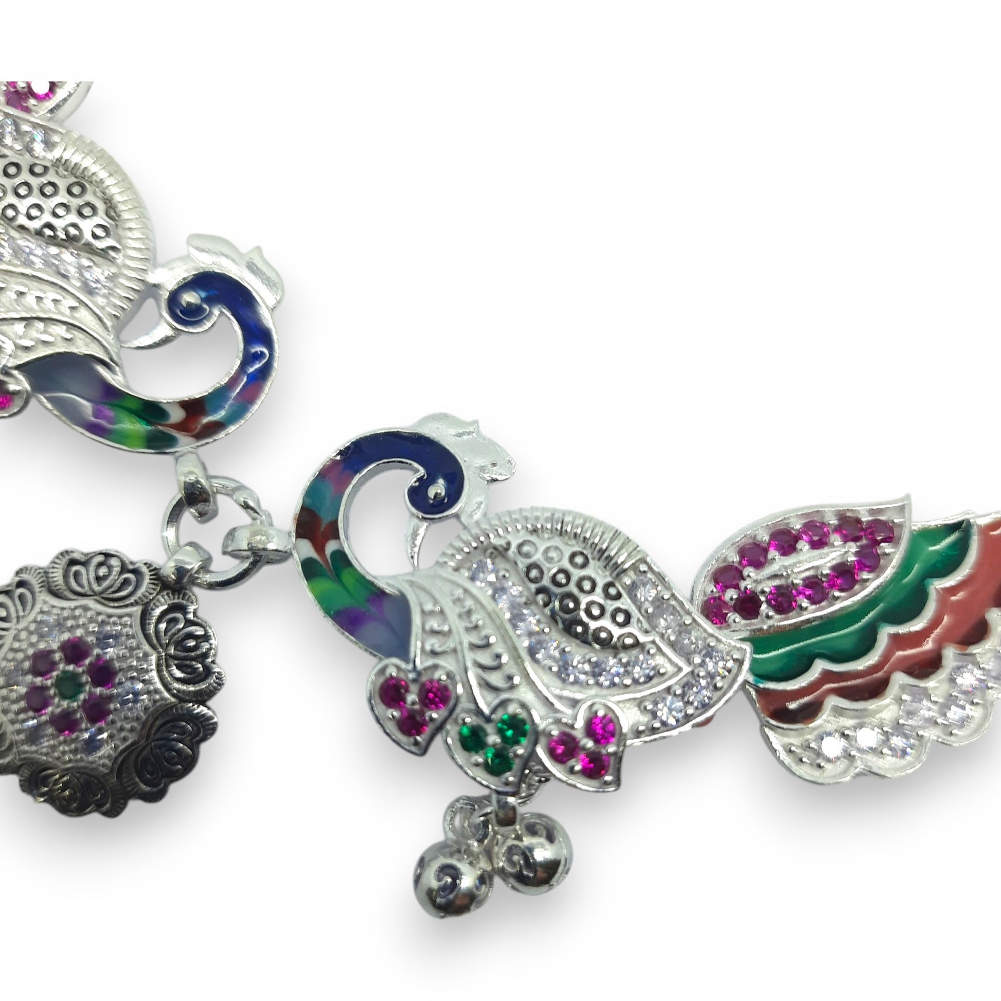 Adorn your feet with the Royal Peacock Charm Anklet, a masterpiece in 925 sterling silver. Featuring intricate peacock motifs, vibrant enamel detailing, and delicate silver embellishments, this piece is perfect for weddings, festive occasions, or traditional wear. A timeless blend of heritage and elegance.
