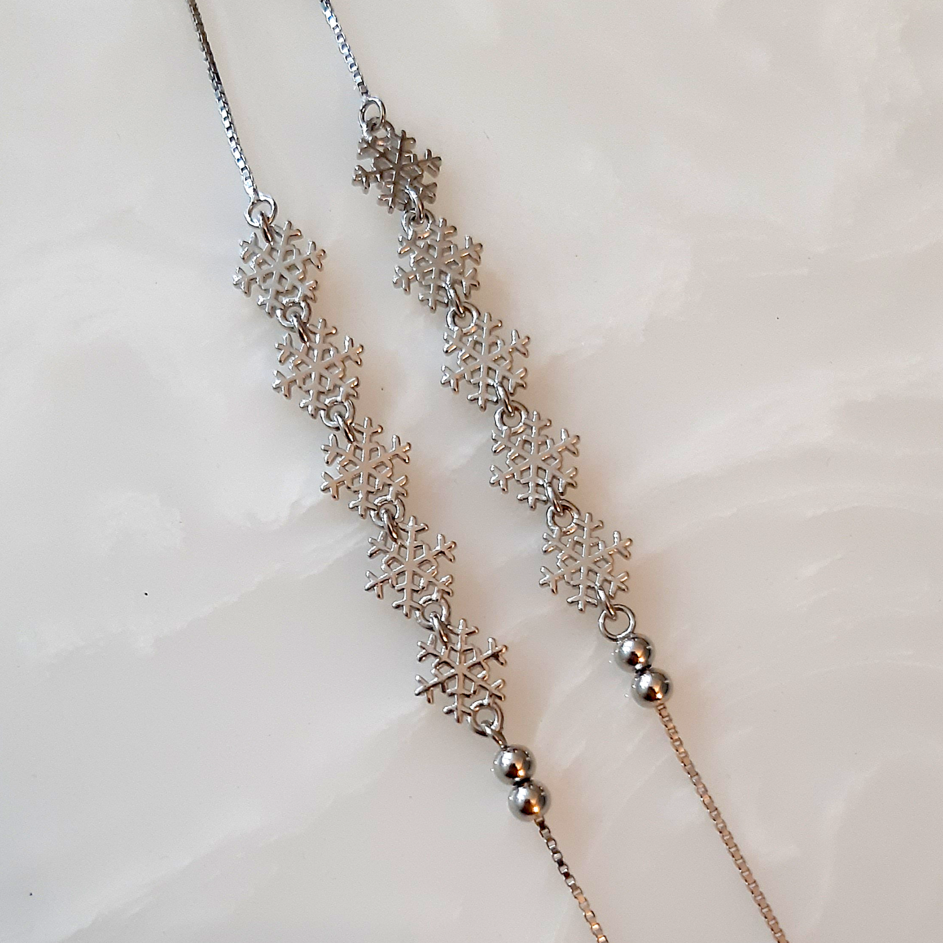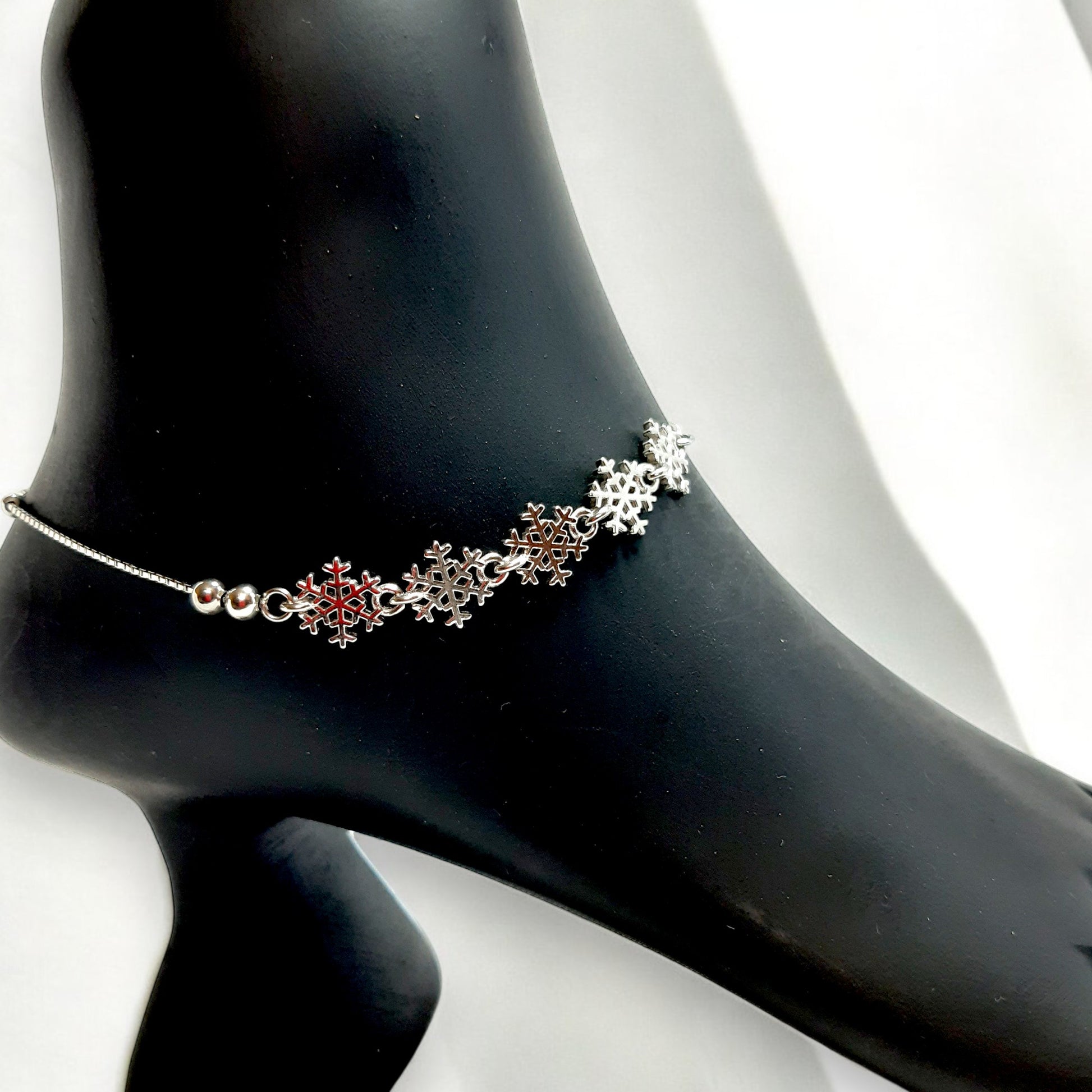 Embrace the delicate beauty of winter with this enchanting sterling silver anklet, featuring a charming array of snowflake motifs. This elegant piece showcases both polished silver snowflakes and a striking red enamel snowflake, adding a pop of festive color to the design. The dainty chain is adorned with small silver beads, leading to the intricate snowflake cluster that gracefully drapes across the ankle. Perfect for adding a touch of seasonal sparkle to your outfit, or simply to express your love for unique and charming jewellery.