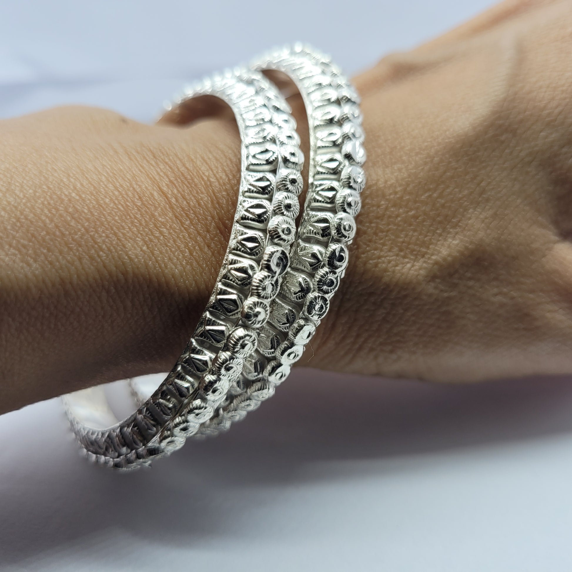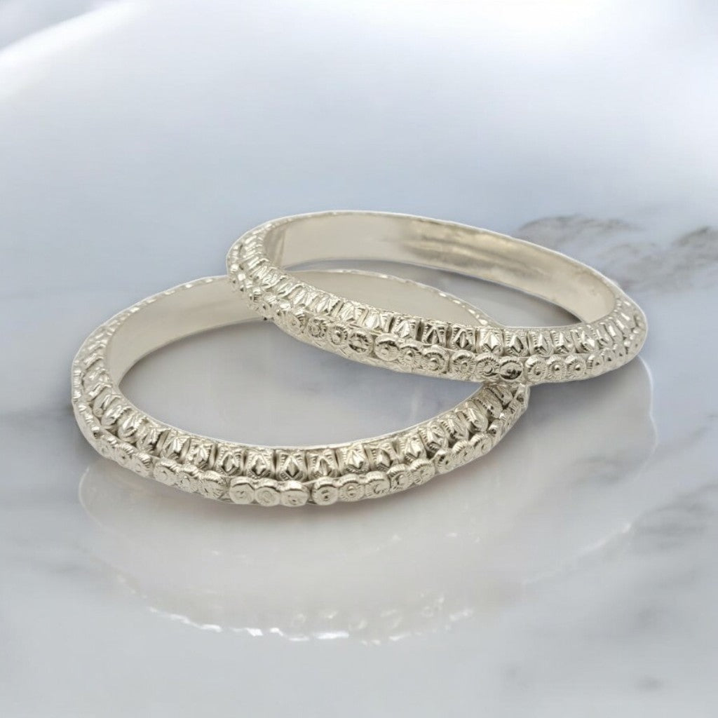 Celebrate the beauty of craftsmanship with this Handcrafted Artisan Silver Bangle Set, a true testament to timeless artistry. Each bangle is meticulously crafted by skilled artisans, featuring unique textures and delicate detailing that highlight the charm of handmade jewellery.