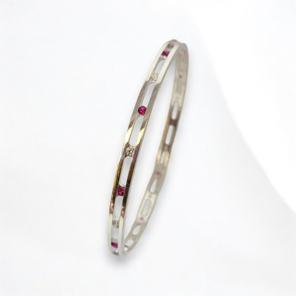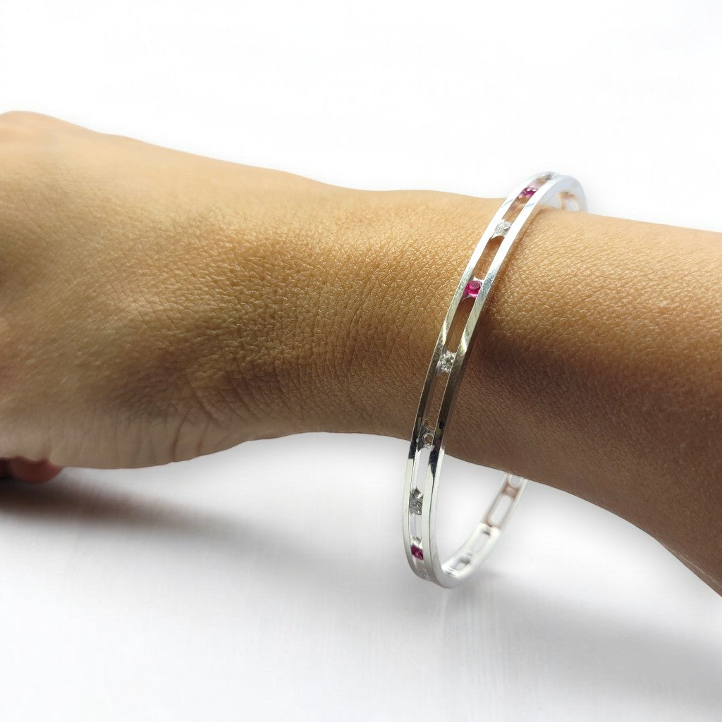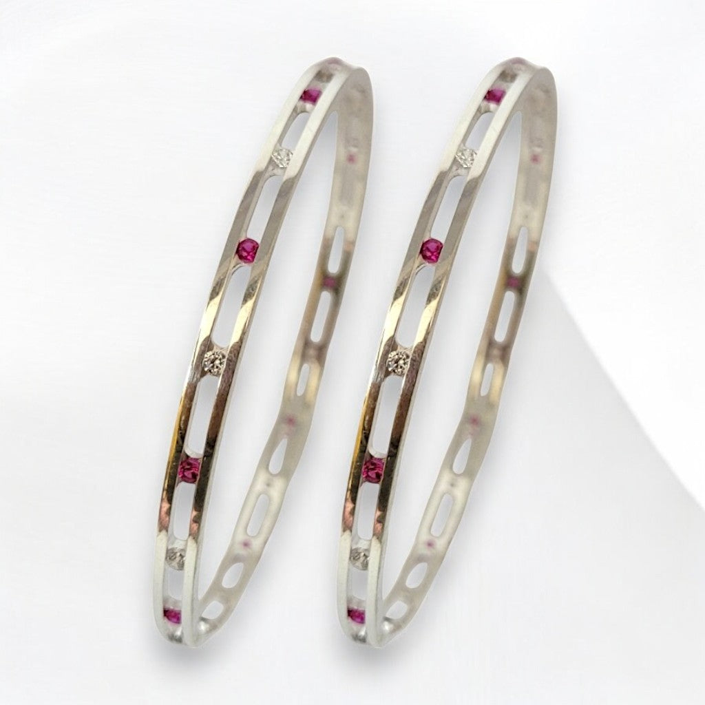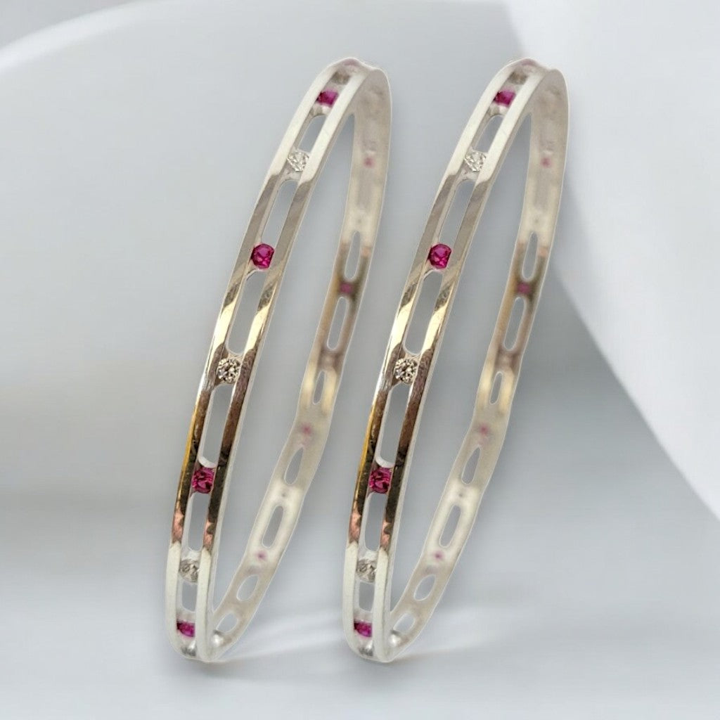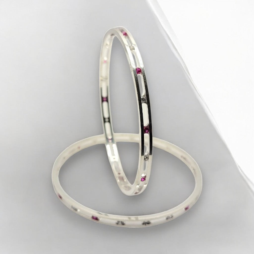 Make a bold yet elegant statement with these modern silver bangles, designed to blend simplicity with striking detail. Featuring sleek lines and a contemporary silhouette, each bangle is accented with radiant pink gemstones that add a vibrant pop of colour and sophistication.