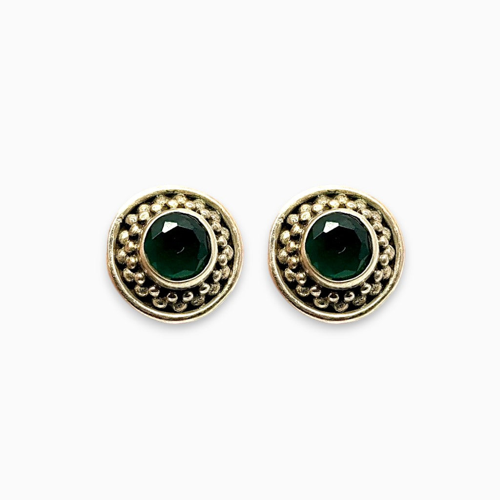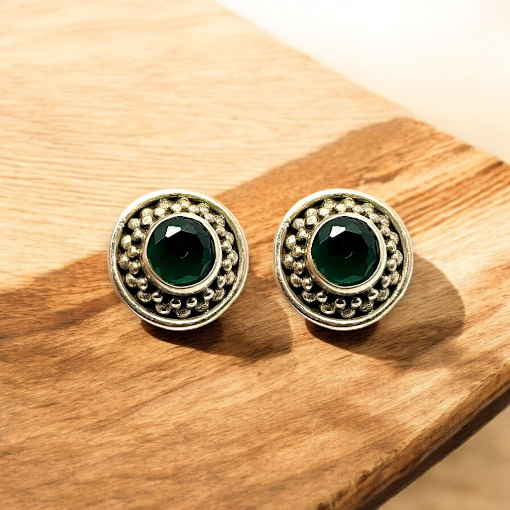 These elegant stud earrings feature a beautiful green onyx stone set in a delicate beaded setting. They are perfect for everyday wear or special occasions.