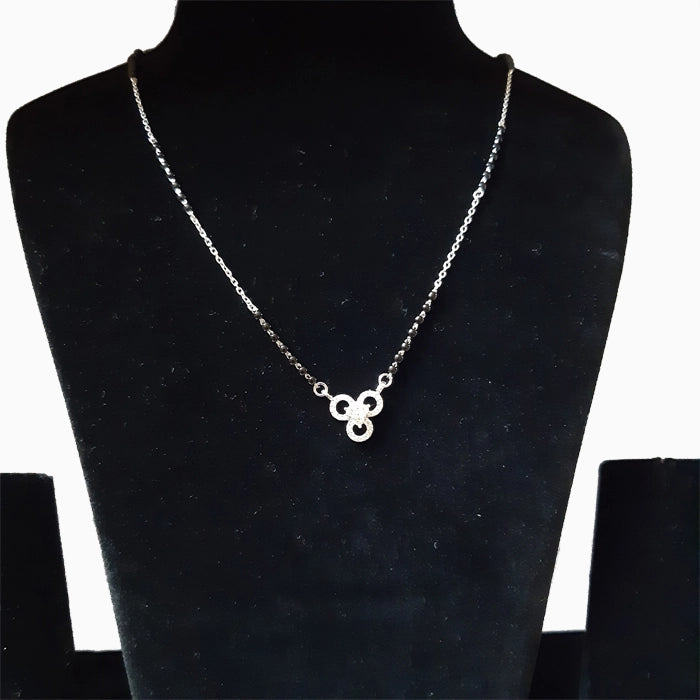 The Eternal Bloom Mangalsutra is a perfect harmony of grace and everlasting love. Its floral-inspired pendant, adorned with dazzling cubic zirconia stones, radiates timeless beauty. The three interlocking loops symbolize unity, growth, and infinite connection, making it a meaningful emblem of marital bliss. The sleek combination of black beads and silver chain brings a modern touch to this traditional ornament, ideal for daily wear or special occasions. A perfect blend of elegance and significance for today’s modern bride.