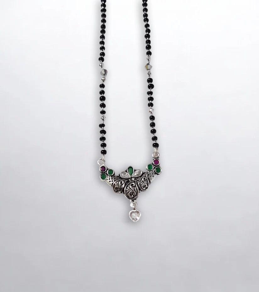The Regal Petals Mangalsutra captures the essence of tradition with a royal twist. Designed with an intricate oxidized silver pendant, it showcases beautifully detailed floral motifs, highlighted by vibrant green and deep ruby red stones. The heart-shaped crystal drop adds a touch of grace and sparkle. Paired with a double-layered black bead chain interspersed with faceted metallic beads, this mangalsutra seamlessly blends timeless artistry with contemporary elegance. A perfect adornment for weddings, cultural celebrations, or everyday elegance, symbolizing eternal love and devotion.