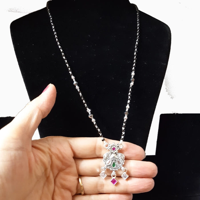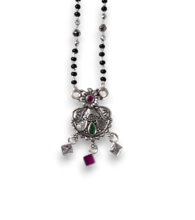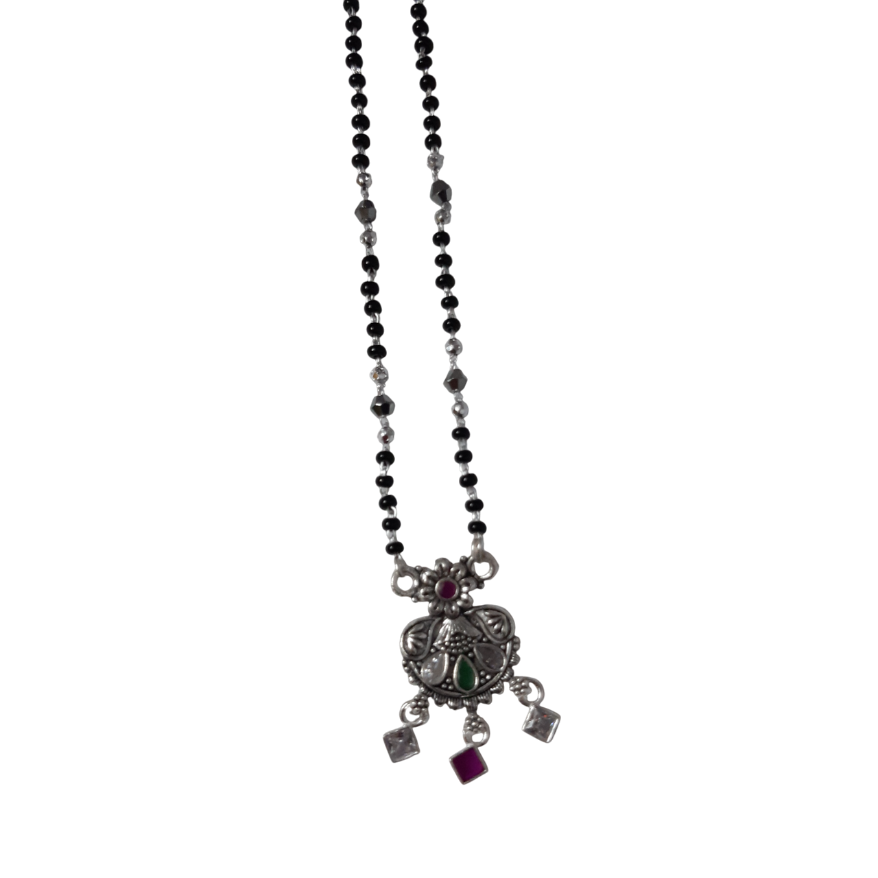 Infused with the charm of tradition and the grace of artistry, the Royal Blossom Antique Mangalsutra stands as a symbol of eternal love. Featuring a striking oxidized silver pendant adorned with floral and peacock motifs, accented with vibrant green and ruby red stones, this piece radiates vintage elegance. The black beaded chain is elevated with faceted metallic beads, adding a touch of contemporary allure. Ideal for the modern bride who cherishes her cultural roots, this mangalsutra is perfect for weddings, festive occasions, or as a treasured heirloom.