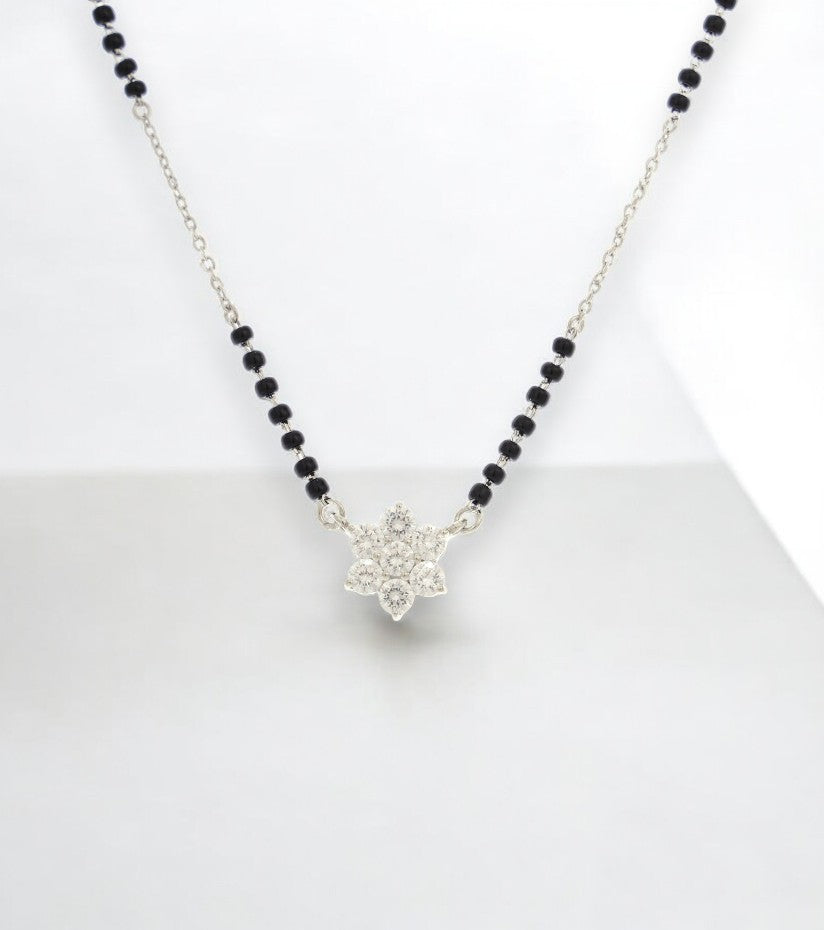 This dazzling sterling silver mangalsutra features a captivating floral pendant adorned with sparkling cubic zirconia stones. The black beads and elegant design make it a beautiful and meaningful symbol of love and commitment.