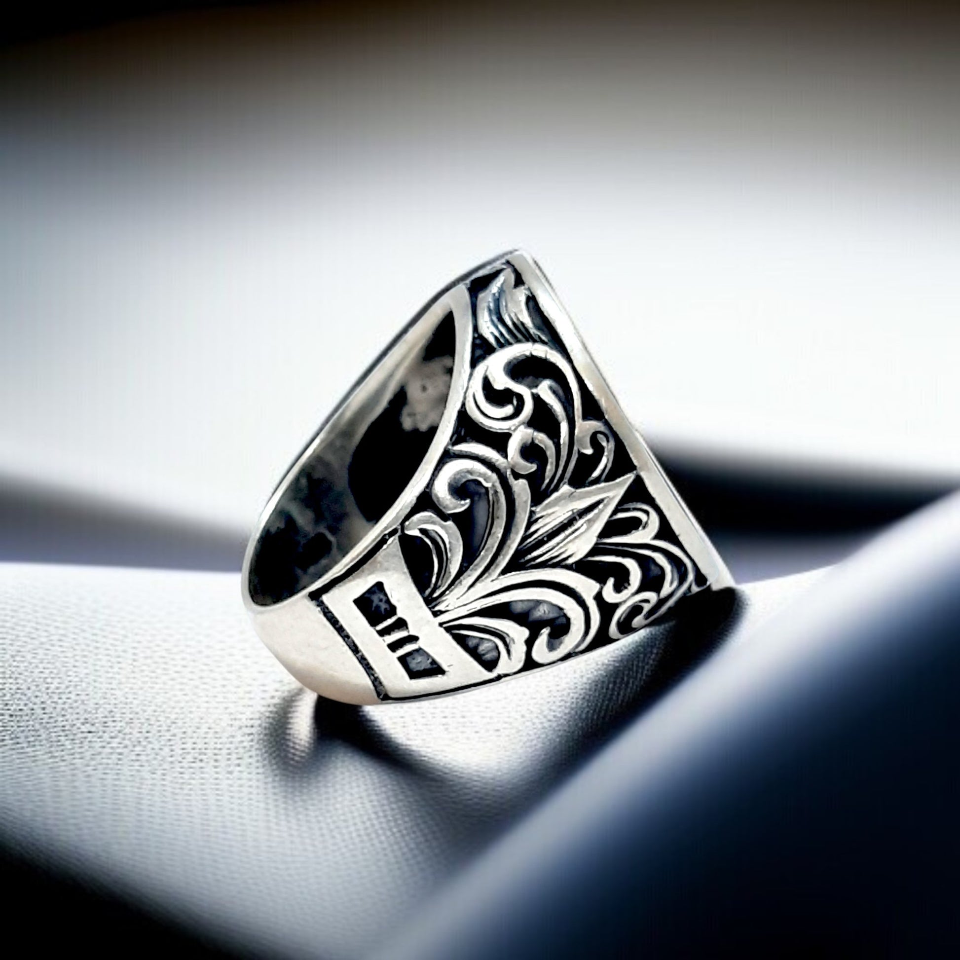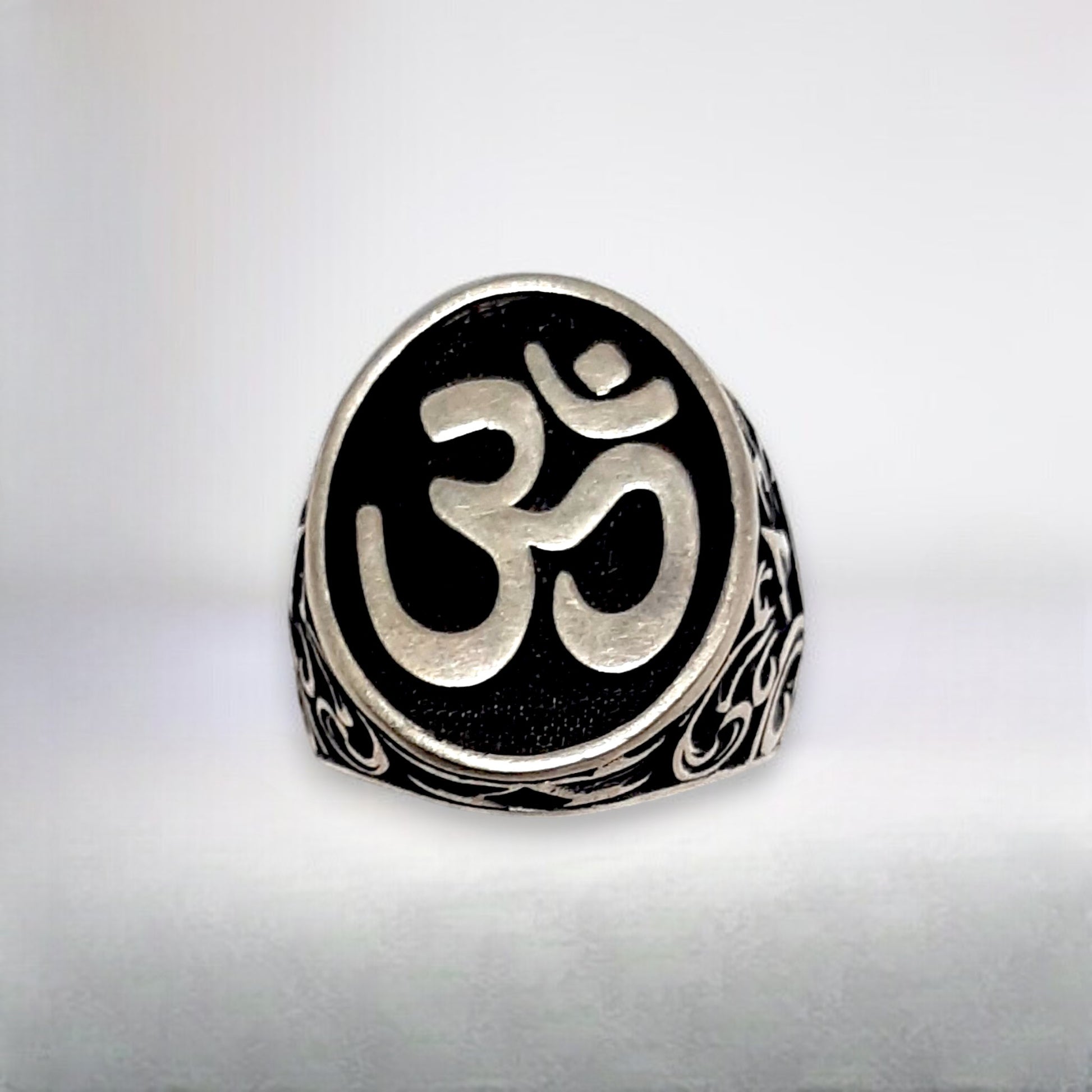 Channel strength, spirituality, and timeless design with the Omkar Sterling Heritage Ring. Handcrafted in premium 925 sterling silver, this bold men’s ring features a finely detailed ‘Om’ symbol engraved on a dark oxidized base, surrounded by intricate traditional patterns. A perfect blend of devotion and artistry, it’s a powerful expression of inner peace and masculine grace.