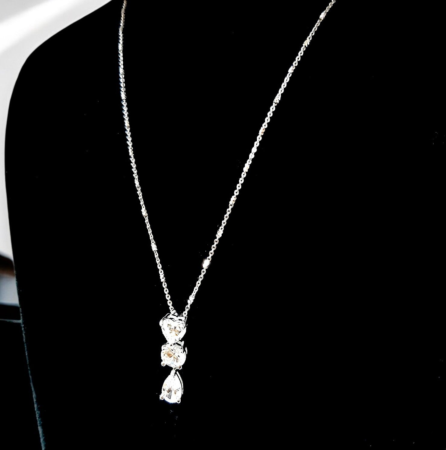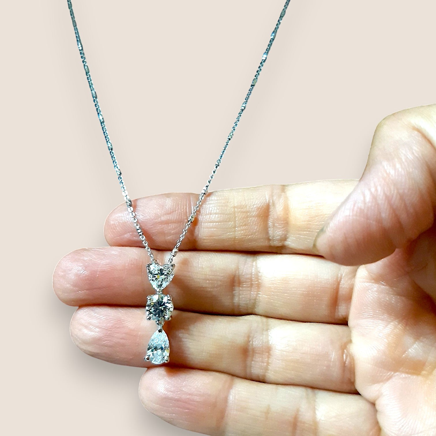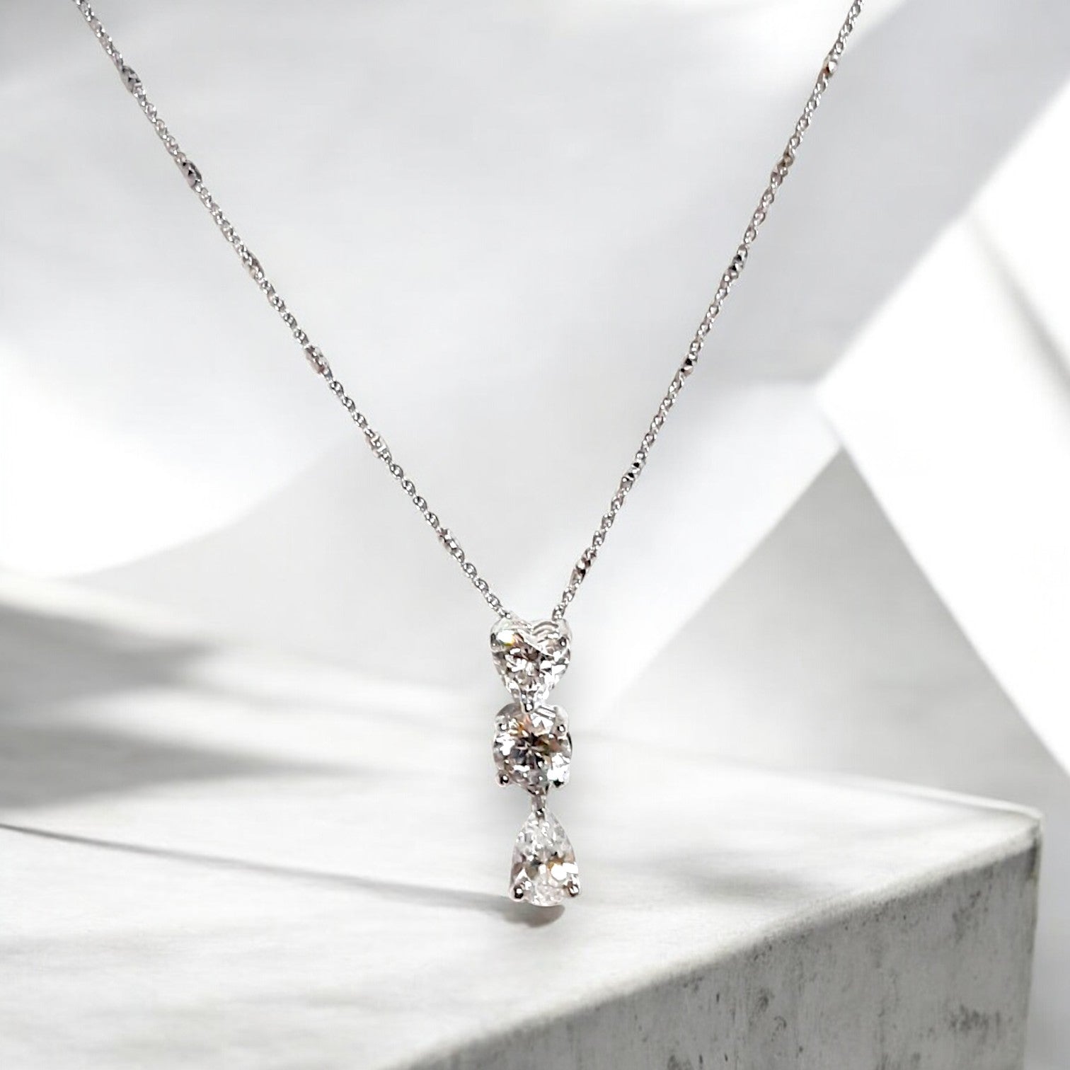 This elegant women's silver necklace features a stunning pendant adorned with three sparkling diamonds, arranged in a chic vertical design. The diamonds are set in a high-quality silver setting, with each stone carefully selected for its brilliant shine. The pendant's clean and sophisticated design is complemented by a delicate chain, adding timeless beauty to any outfit. Perfect for both everyday wear and special occasions, this necklace exudes grace and elegance. Whether worn as a statement piece or layered with other jewelry, it is sure to capture attention and add a touch of luxury to your jewelry collection.