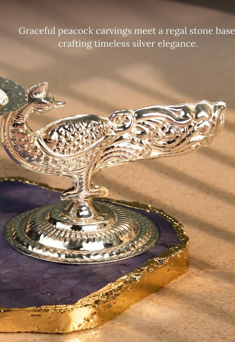 Elevate your pooja rituals with this handcrafted 925 silver peacock diya—an elegant, pure silver lamp designed to bring light and positivity to your home. The intricate peacock motif symbolizes grace and prosperity, making it an ideal choice for festive decor or gifting on Diwali and other auspicious occasions.