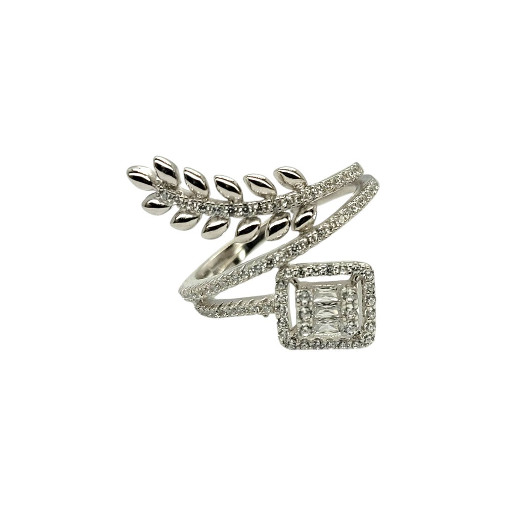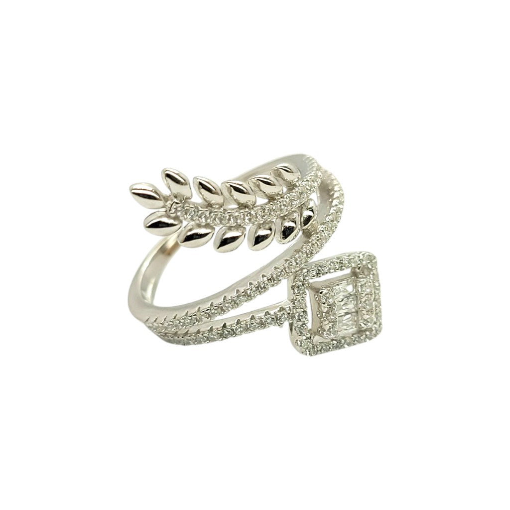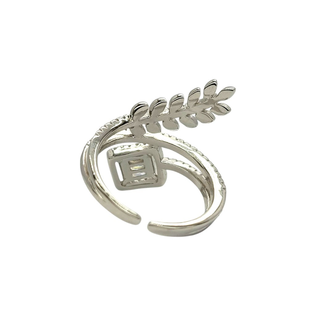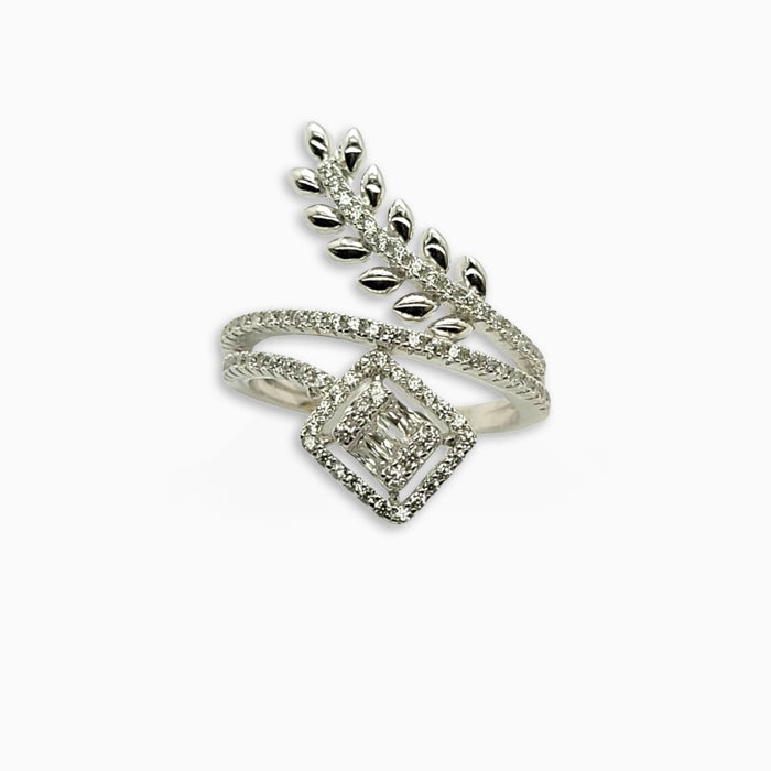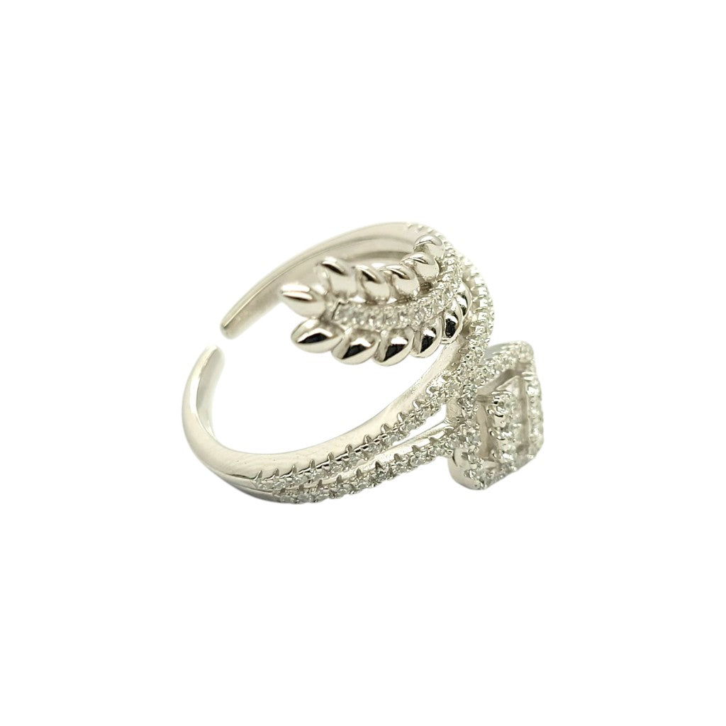 A delicate vine-inspired design with a square-cut diamond centerpiece, symbolizing growth and elegance. The pavé-set leaves add a touch of natural beauty to this adjustable open-band ring.
