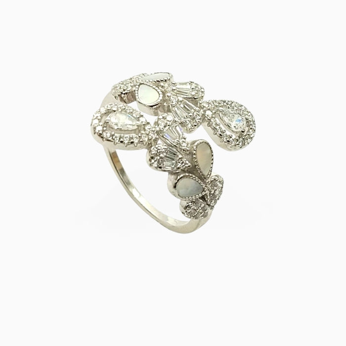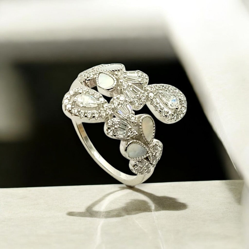 With a perfect fusion of natural elements and timeless sparkle, the Ethereal Grace Ring captivates with its teardrop petals and dazzling zirconia.