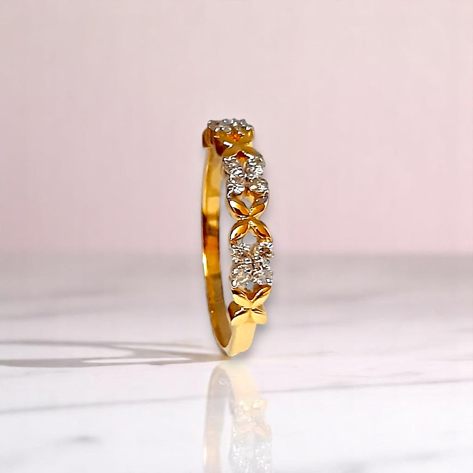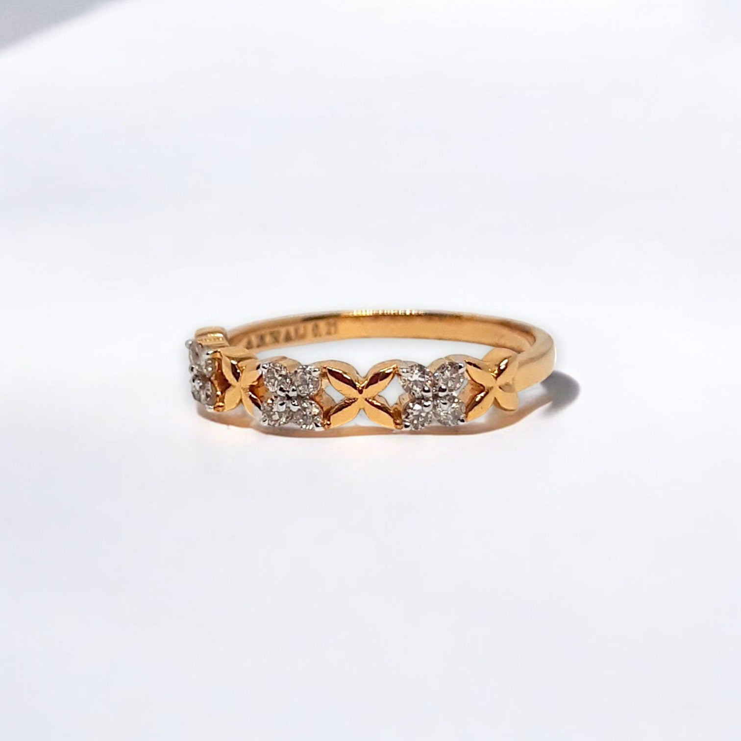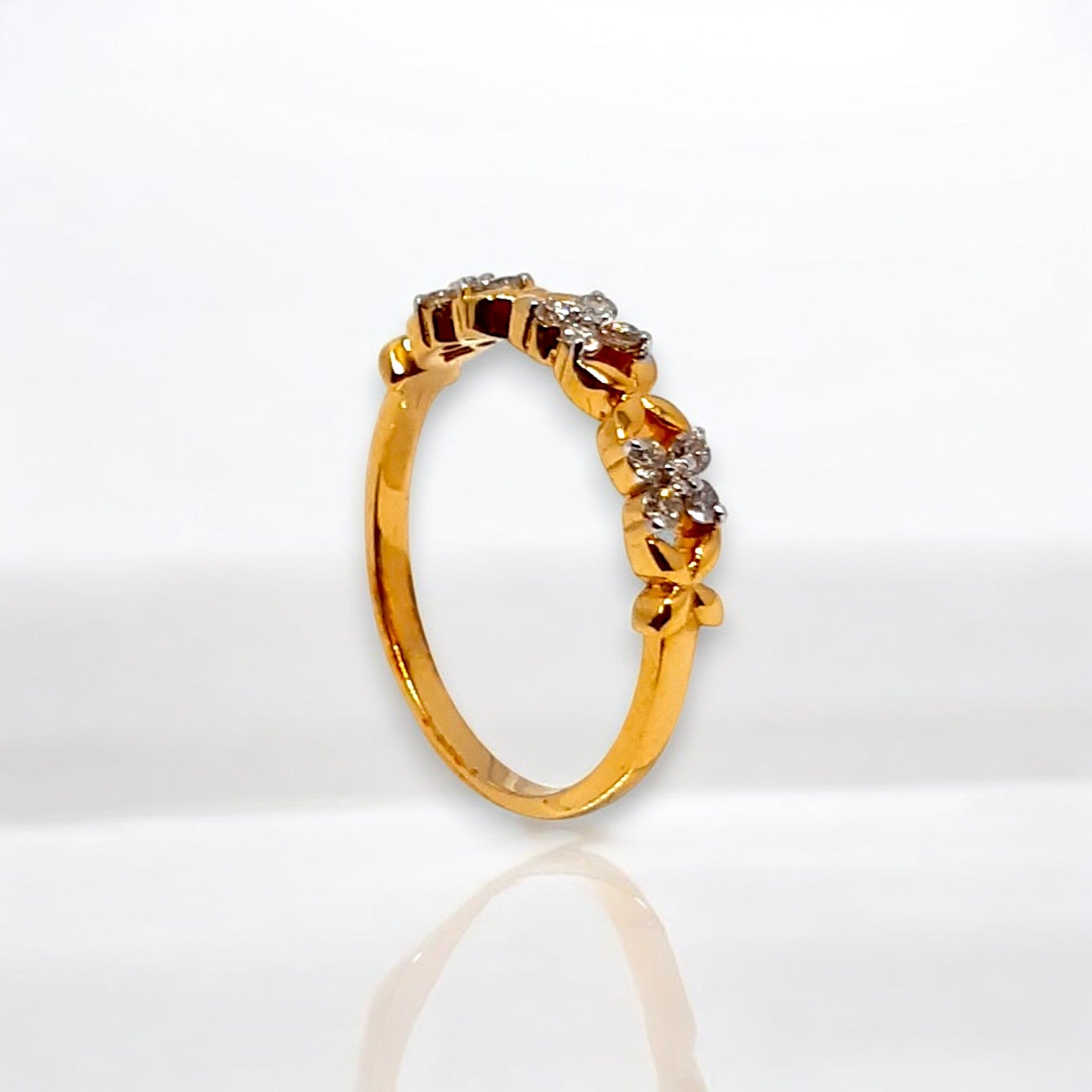 Delicate golden forms, reminiscent of frozen blossoms or quatrefoils, are set along this slender band, each alight with a cool, intense sparkle from the meticulously set stones. This ring offers a striking contrast of warmth and icy brilliance.