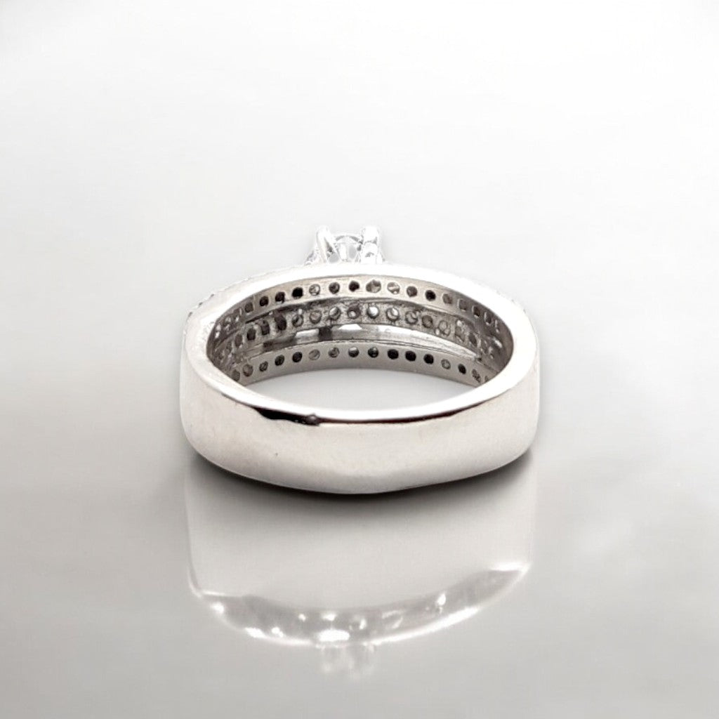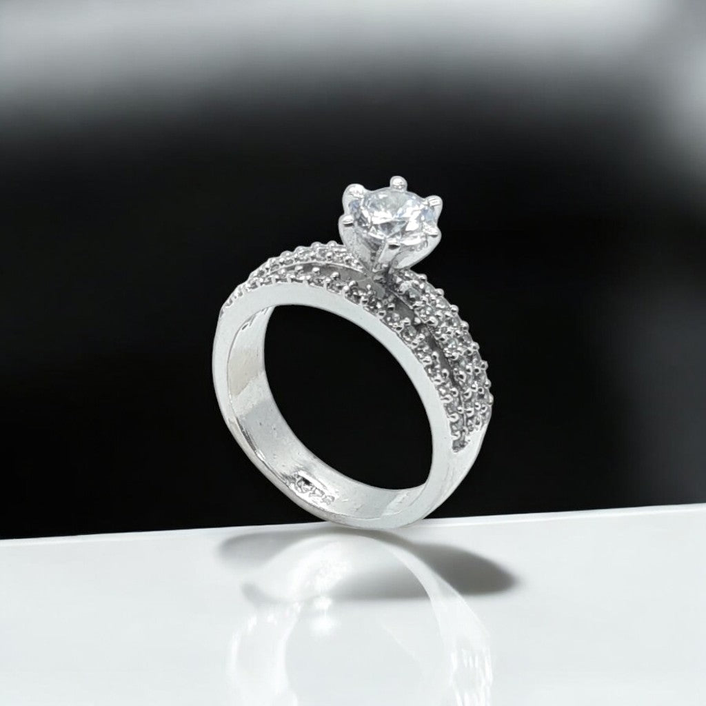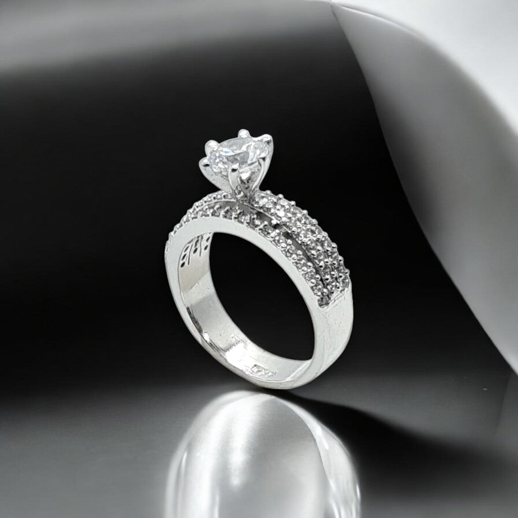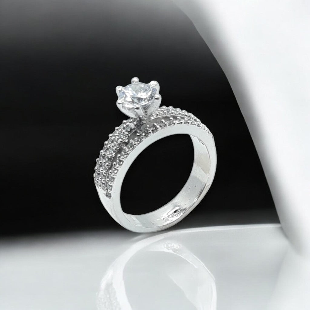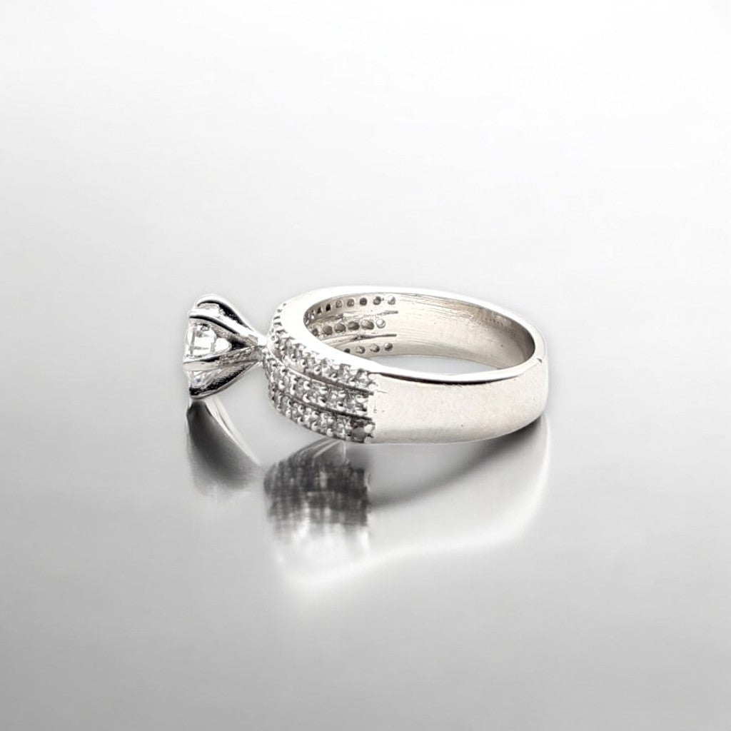 A bold and regal design with a crown-inspired prong setting, holding a dazzling center stone. The intricate pavé detailing on the band enhances its luxurious appeal.