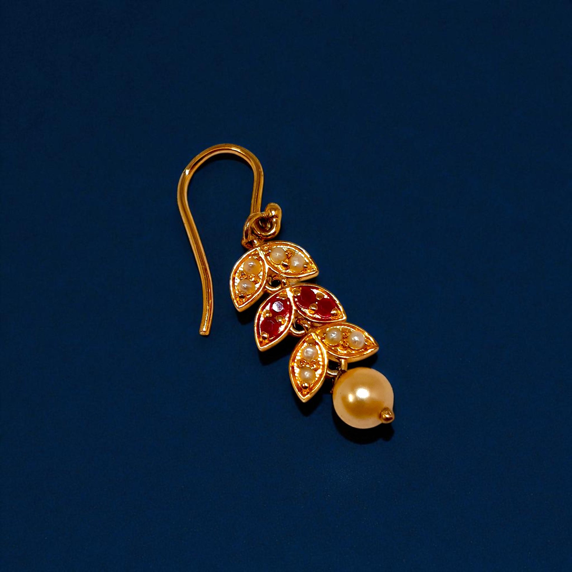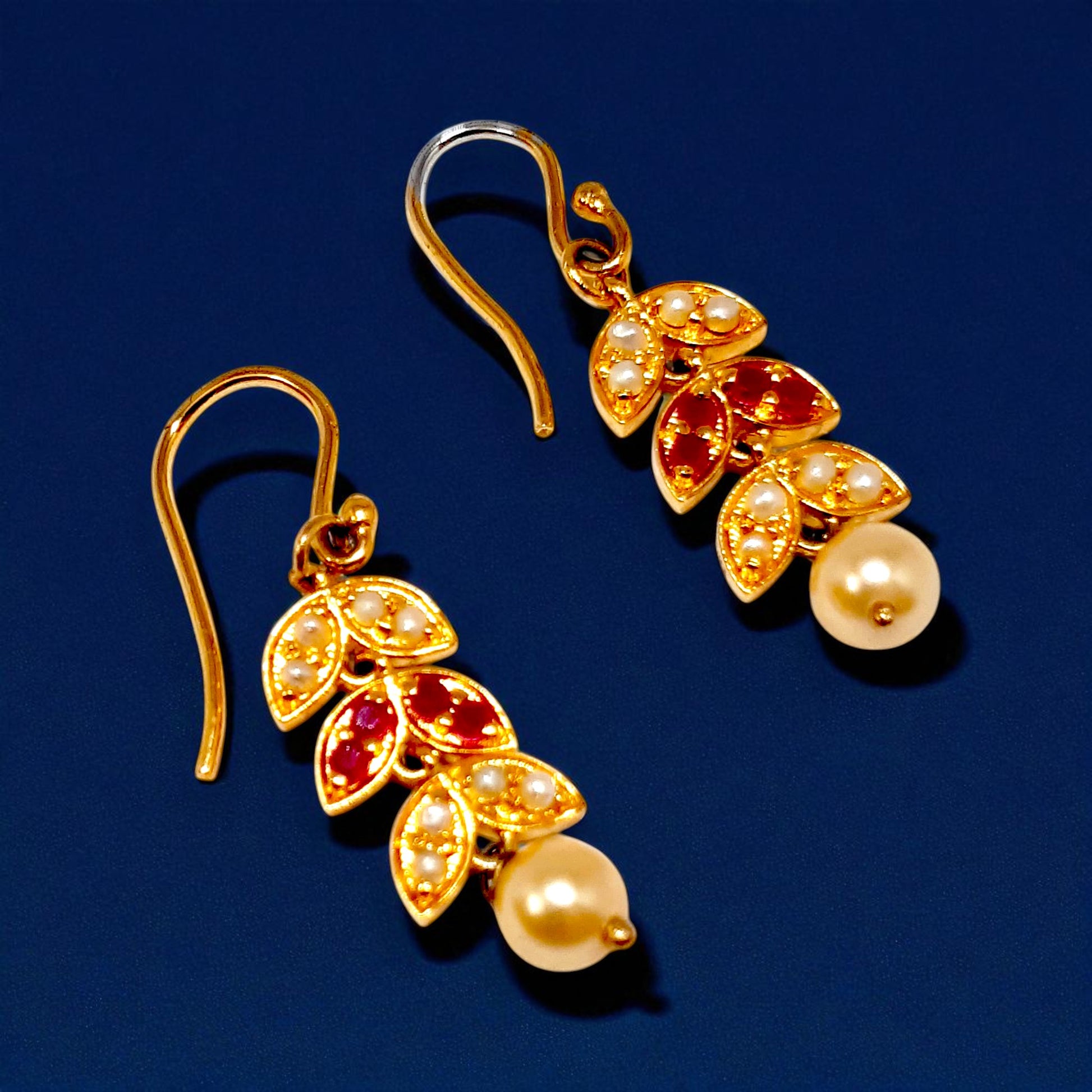 Grace your look with timeless elegance in our Ruby Bloom Pearl Drop Earrings. Crafted in a rich gold-tone finish, these 925 silver earrings feature intricate leaf motifs adorned with sparkling red stones and dainty pearl accents. A luminous pearl drop completes the design, adding a touch of sophistication and charm. Perfect for festive occasions, weddings, or a regal everyday statement, these earrings beautifully blend traditional aesthetics with modern grace.