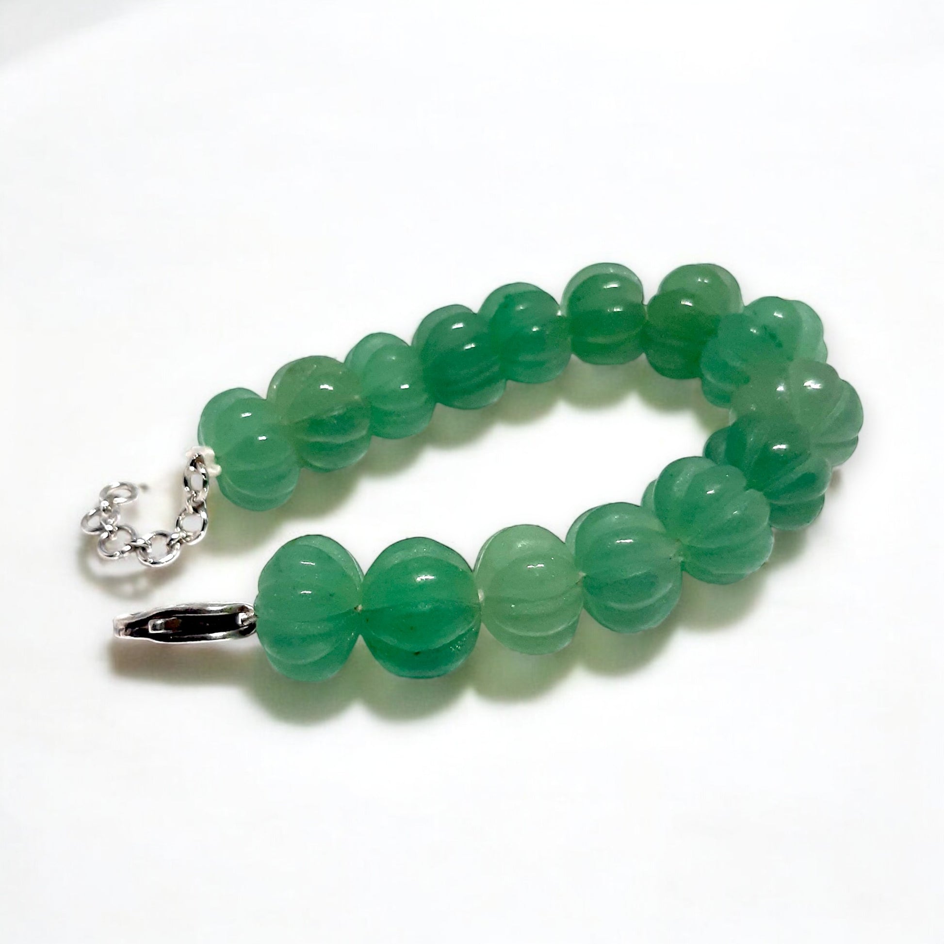 Elevate your style with the calming beauty of our Aventurine Bloom Carved Bead Bracelet, a perfect blend of elegance and natural charm. Crafted with finely carved aventurine beads in a soft green hue, each bead features delicate floral-inspired detailing that adds depth and uniqueness to the design.