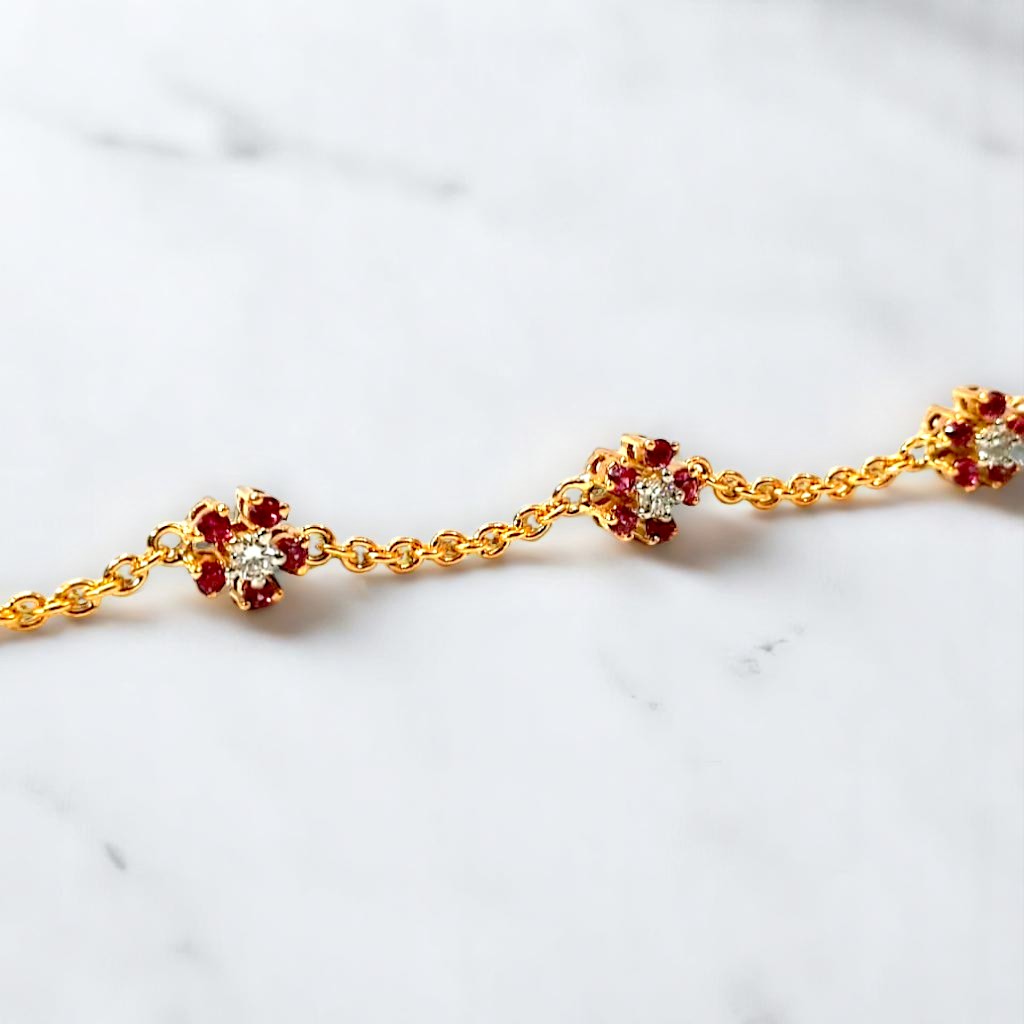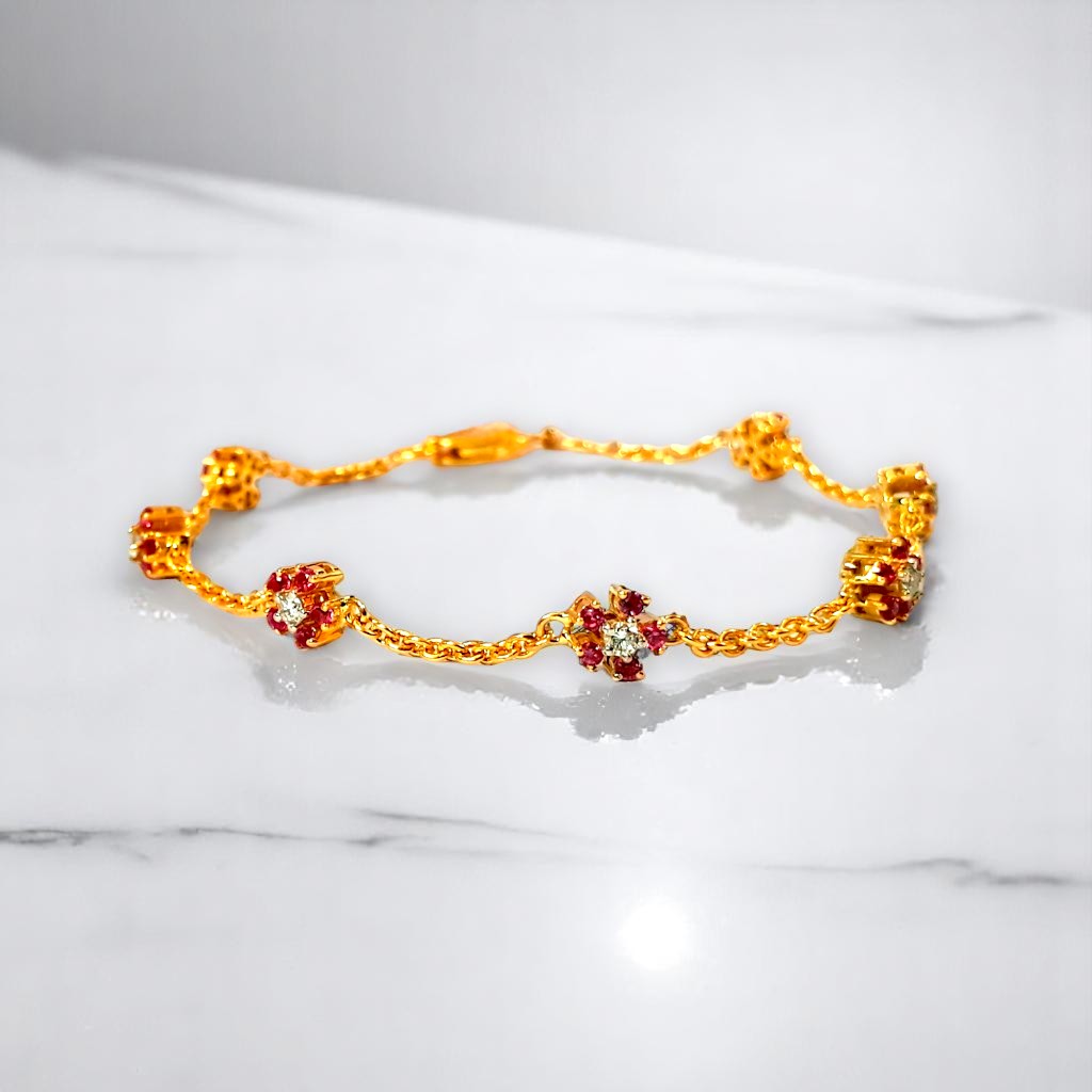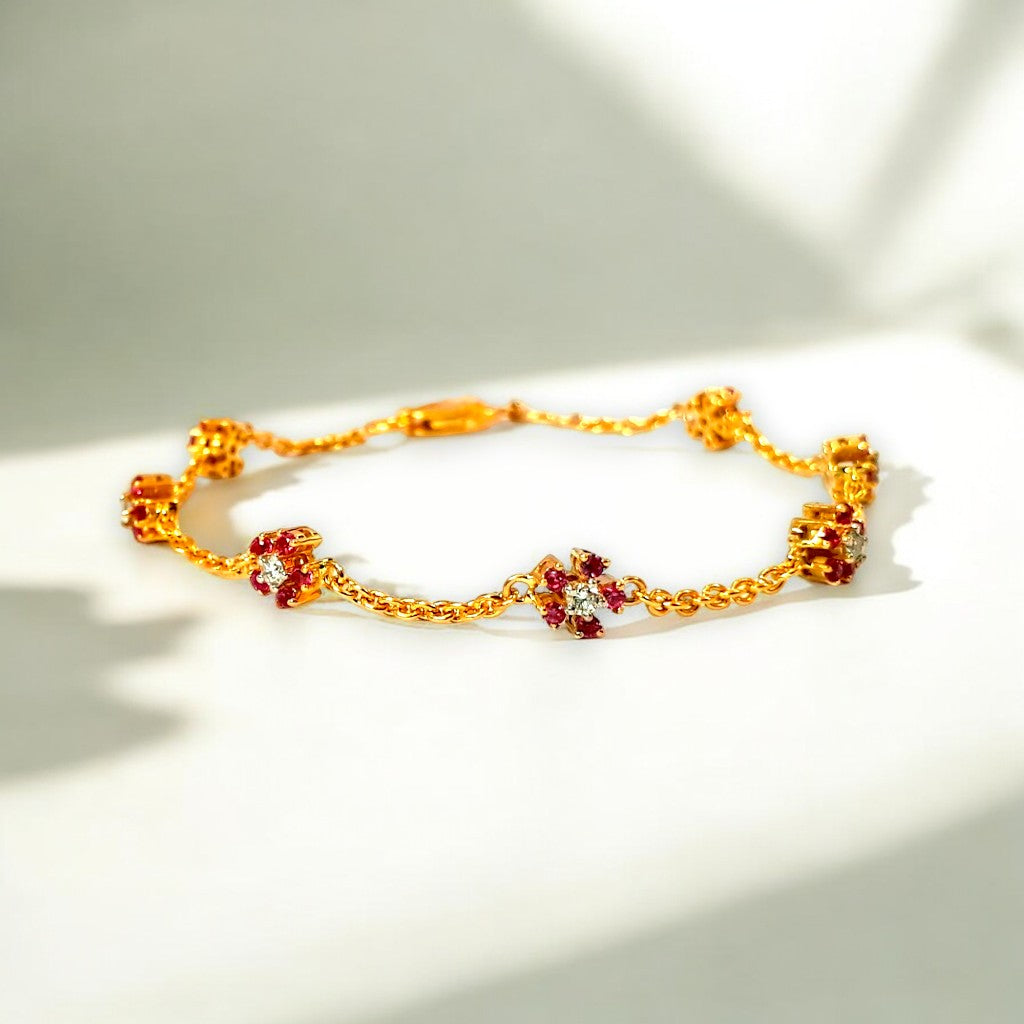 Delicate golden settings cradle vibrant cherry-red stones, reminiscent of blooming flowers touched by fire. A central white stone in some settings adds a focal point of pure light. This bracelet speaks of delicate beauty with a hint of passionate intensity.