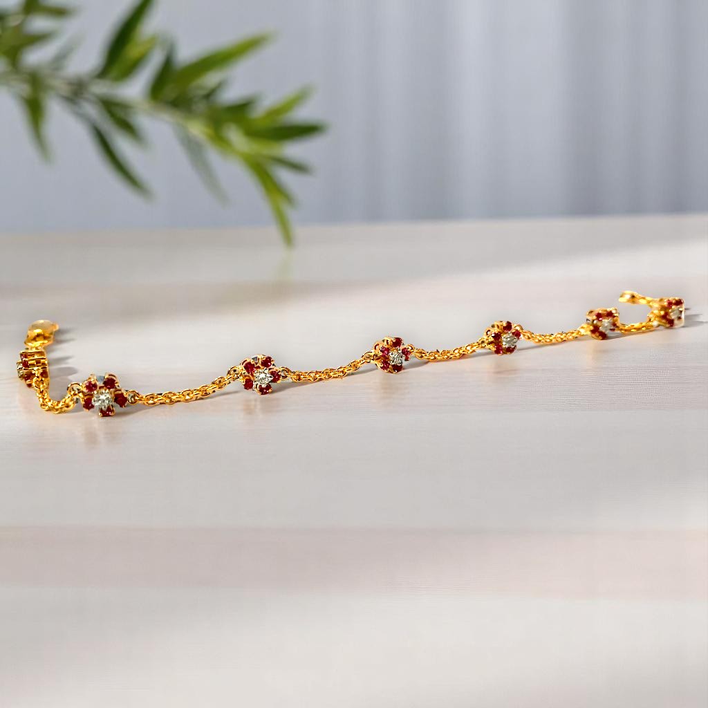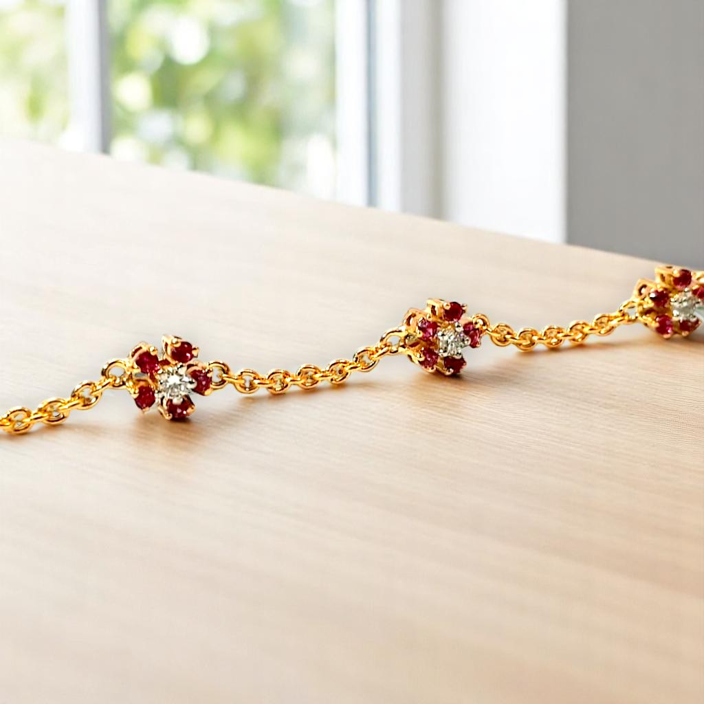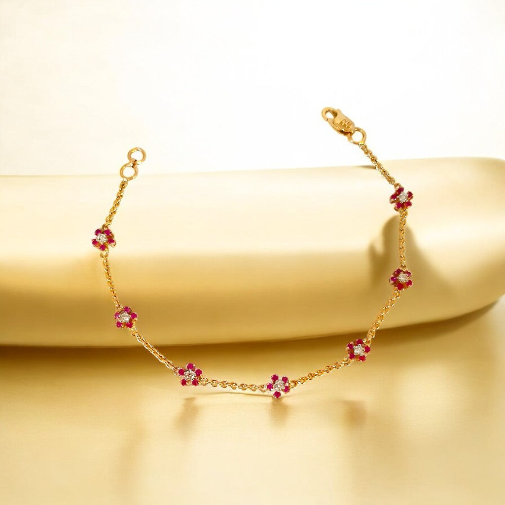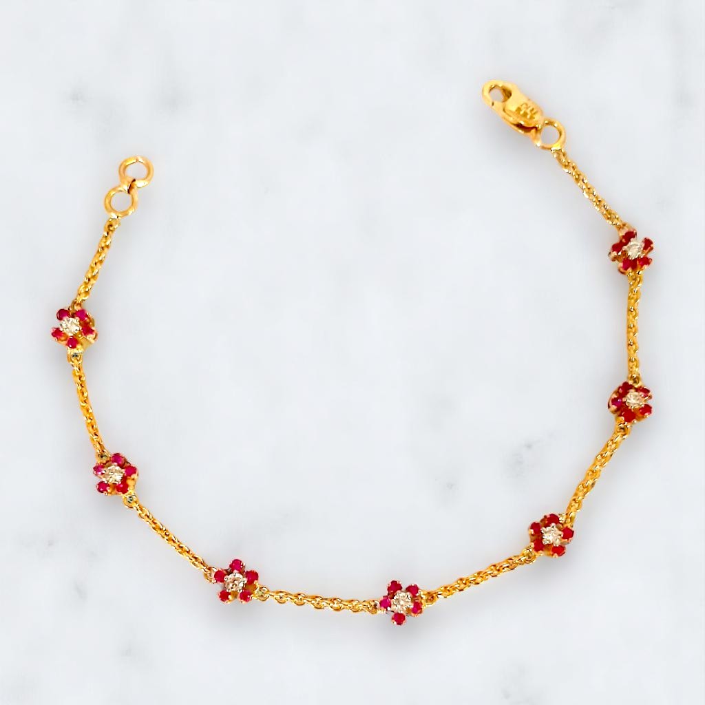 Delicate golden settings cradle vibrant cherry-red stones, reminiscent of blooming flowers touched by fire. A central white stone in some settings adds a focal point of pure light. This bracelet speaks of delicate beauty with a hint of passionate intensity.
