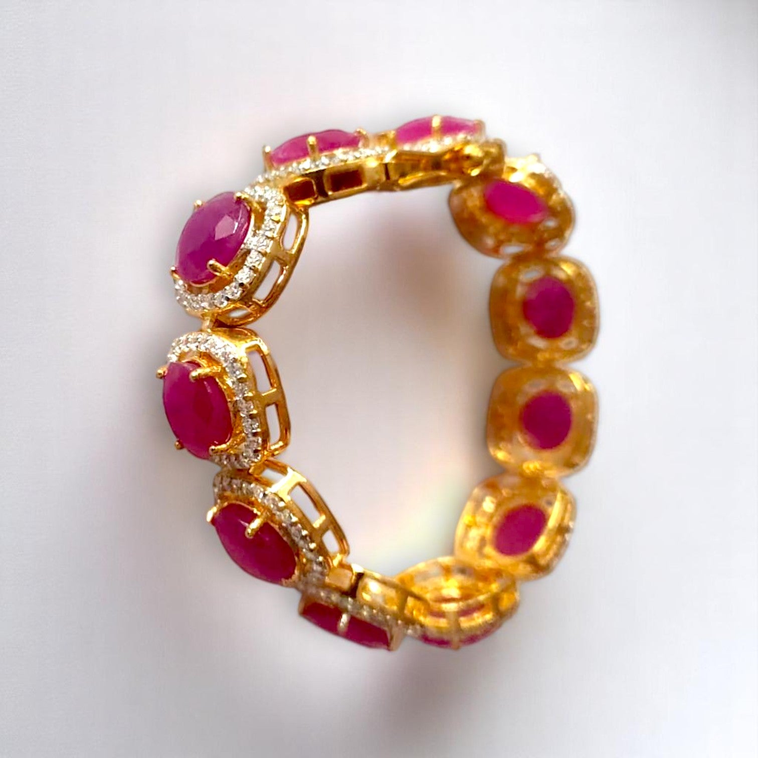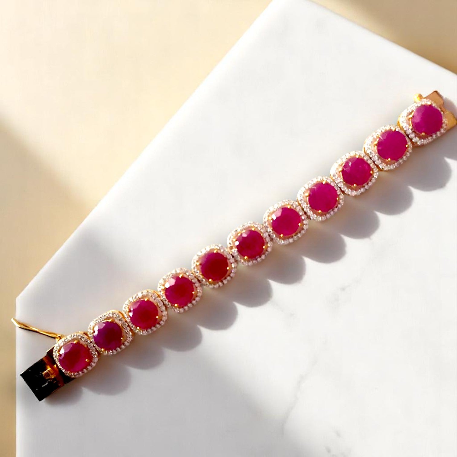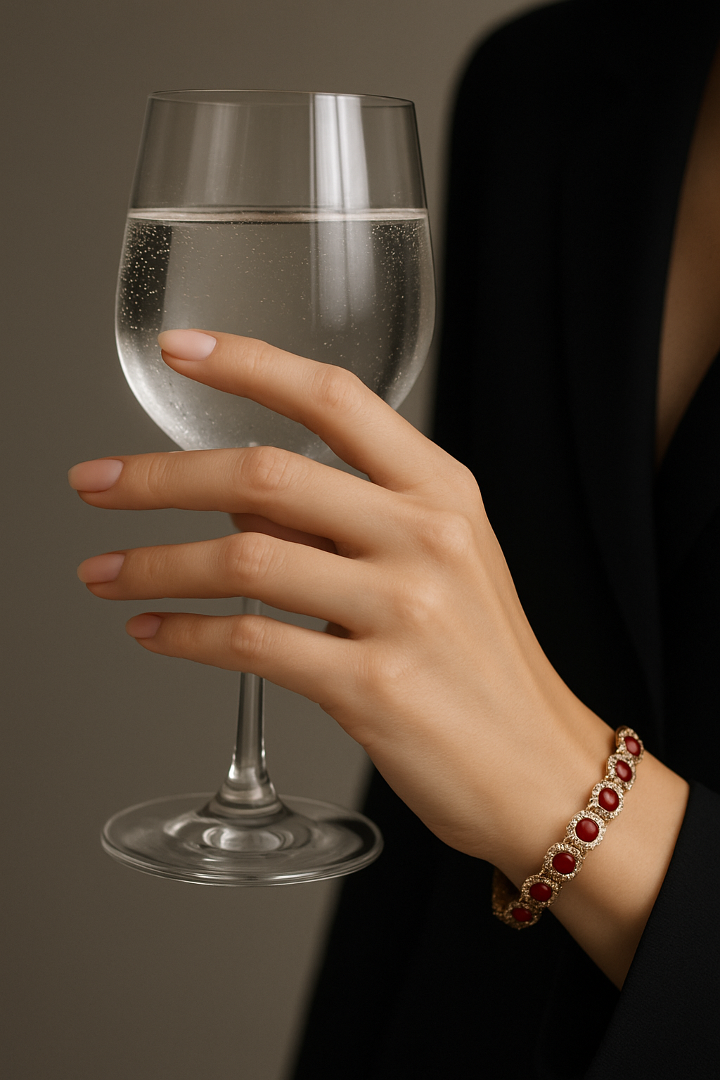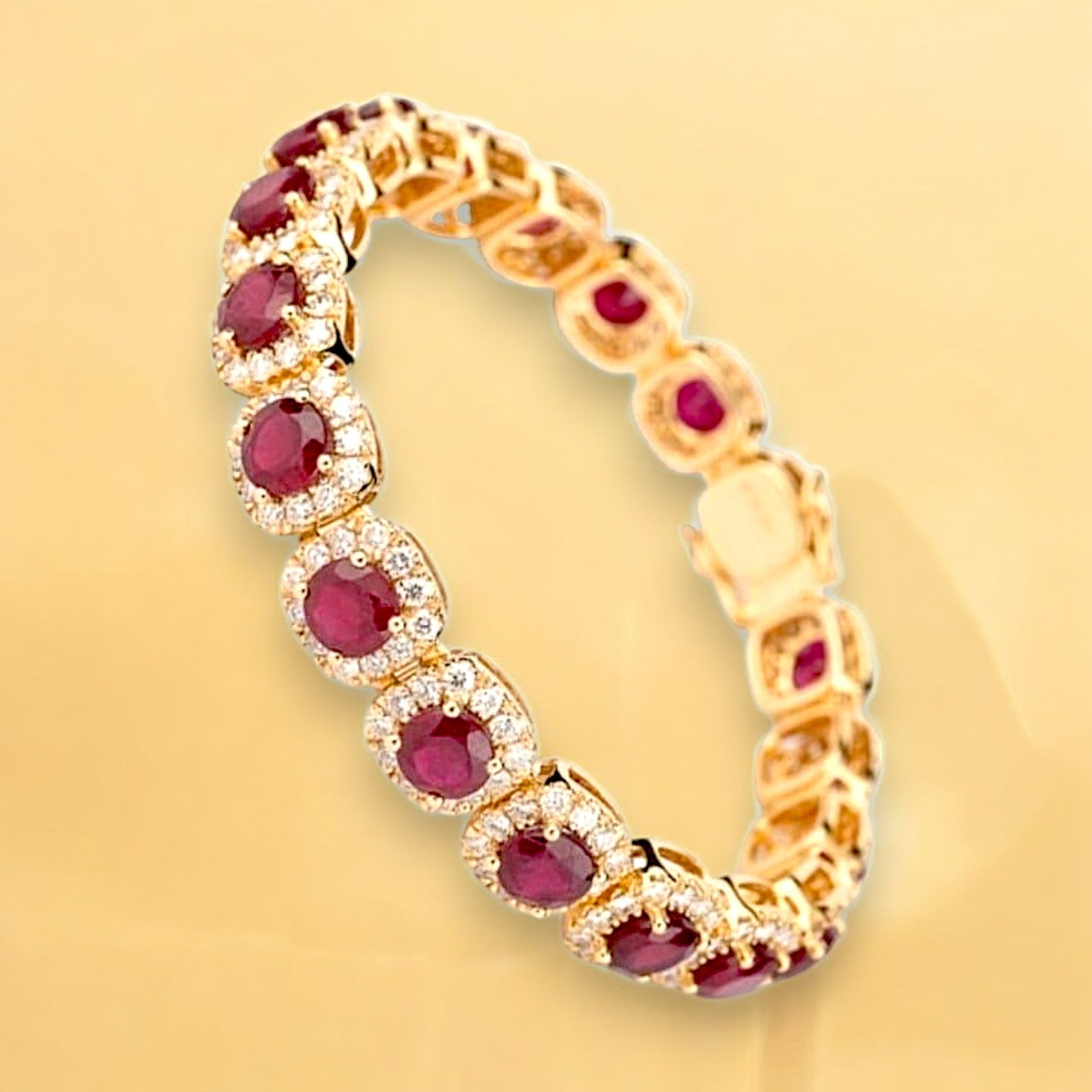 Like tiny crimson fireflies captured in golden light, oval rubies glow with vibrant color, each surrounded by a delicate halo of sparkling diamonds, all set in warm yellow gold on sterling silver.