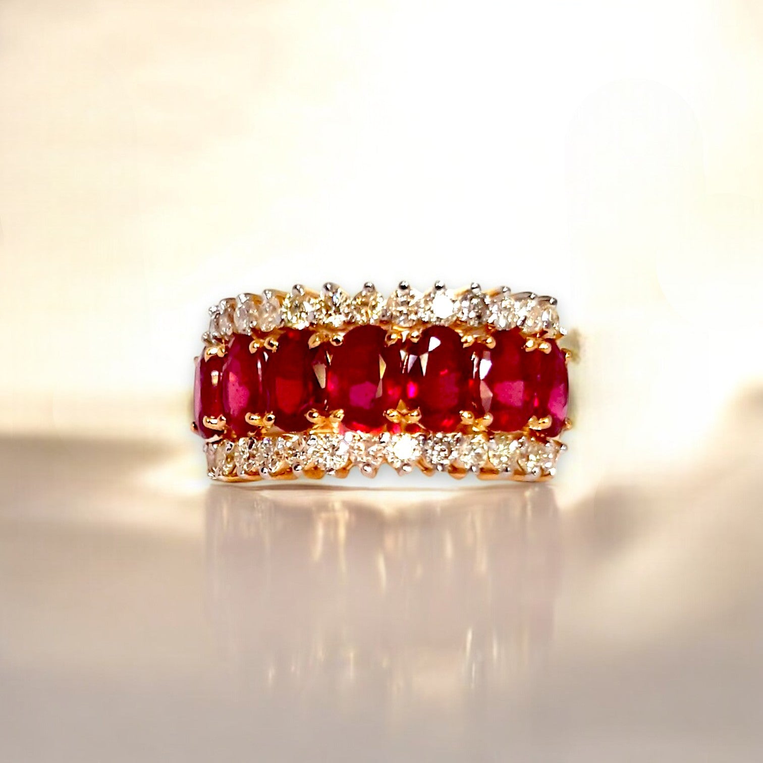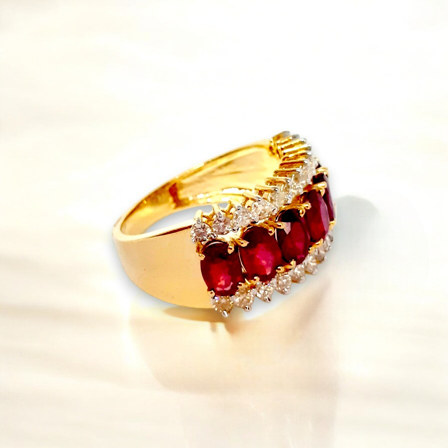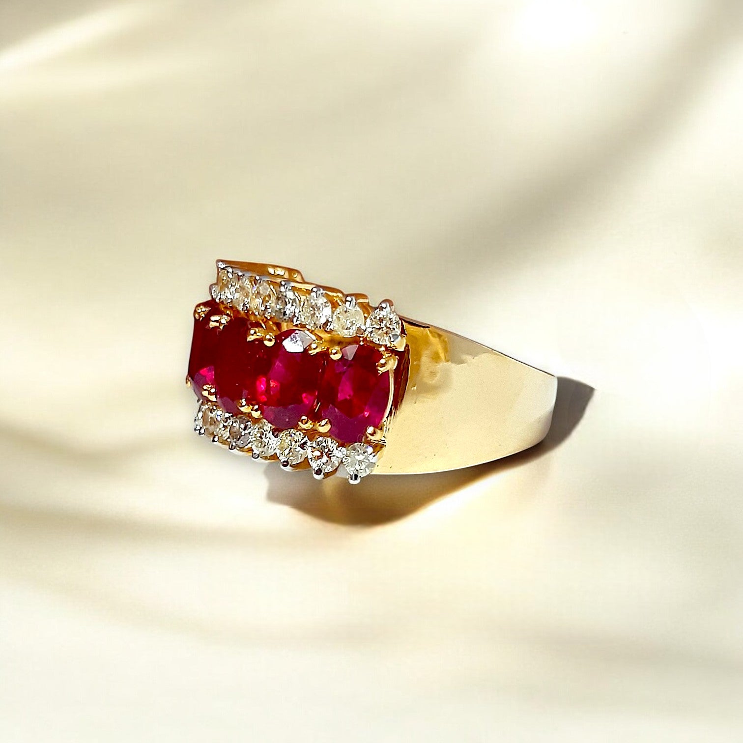 Make an unforgettable impression with the Crimson Royale Statement Ring—a bold masterpiece from Khushron Jewels. This regal ring features a trio of radiant crimson rubies, embraced by sparkling rows of white stones that add depth, fire, and brilliance. Crafted in a warm gold setting, the design evokes vintage charm with a modern edge. Whether it's an occasion or an indulgent everyday piece, this ring embodies luxury, passion, and power in every facet.
