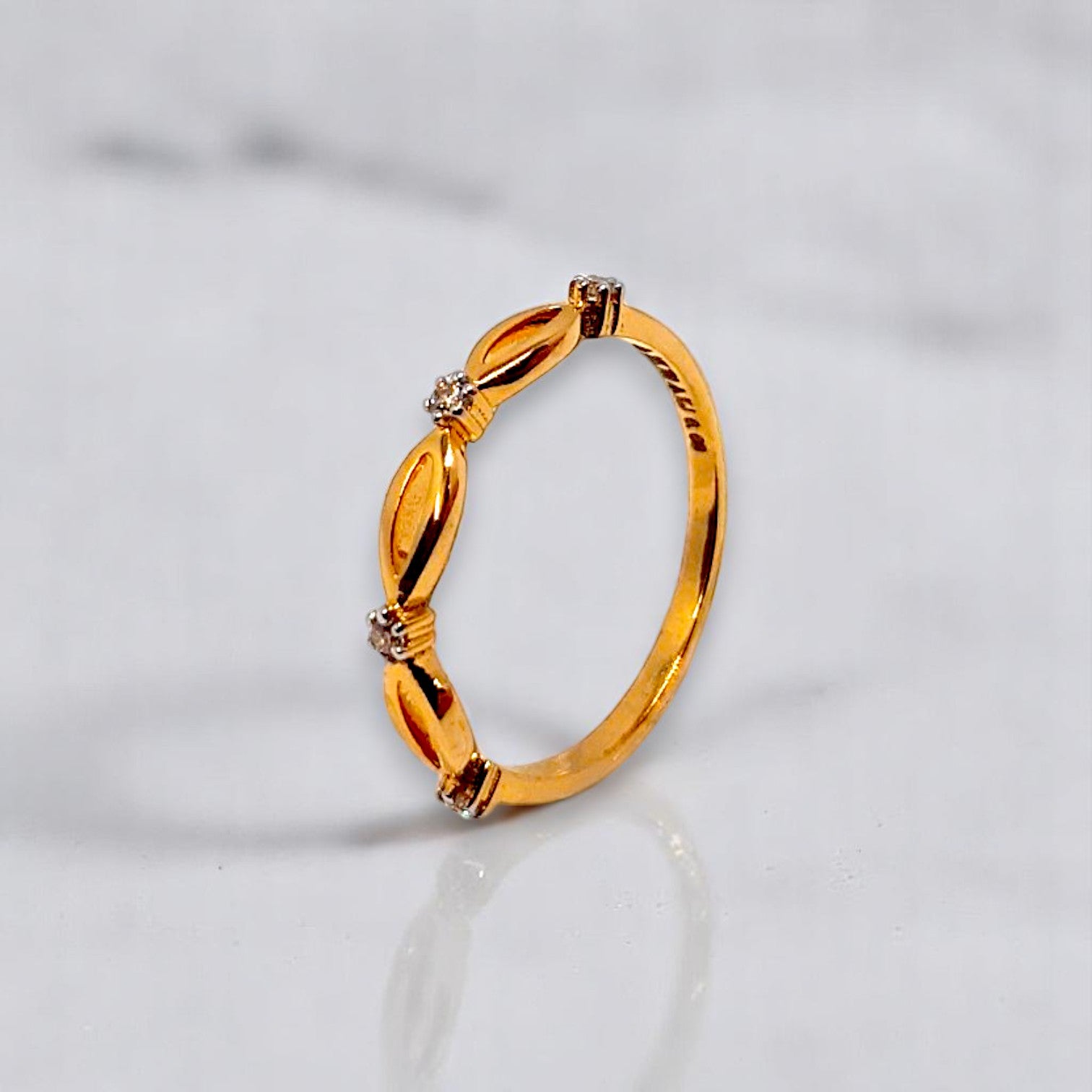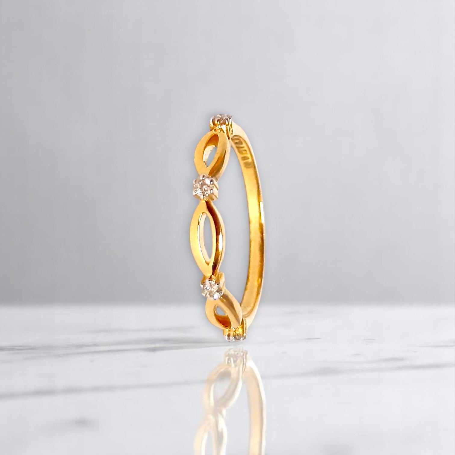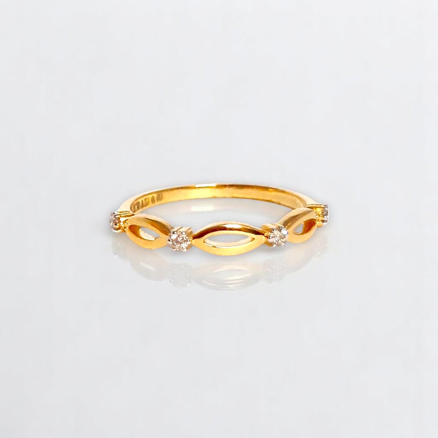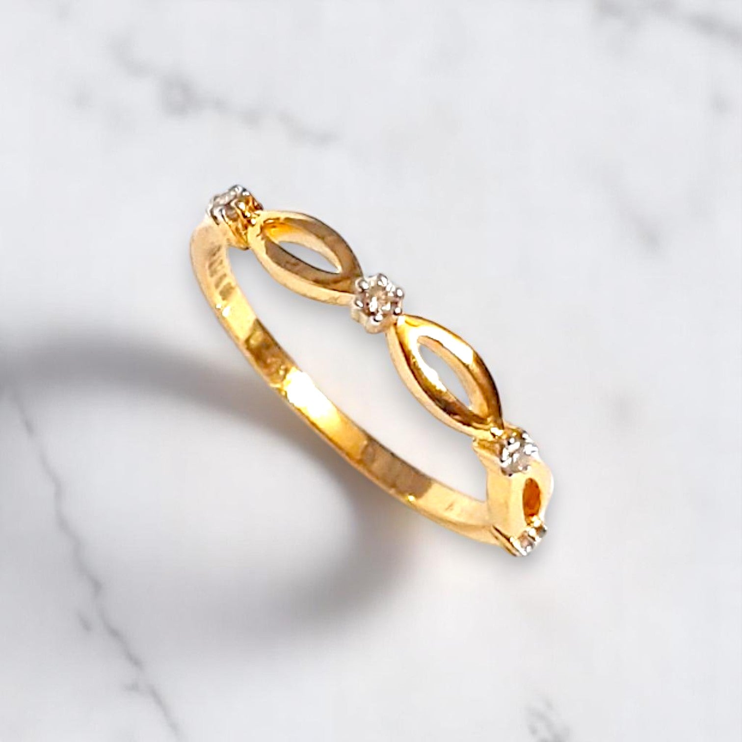 A fine gold band gracefully connects three delicate marquise shapes, their openwork designs allowing the inner sparkle of the stones to truly gleam. This ring embodies connection and flowing elegance with a touch of captivating light.