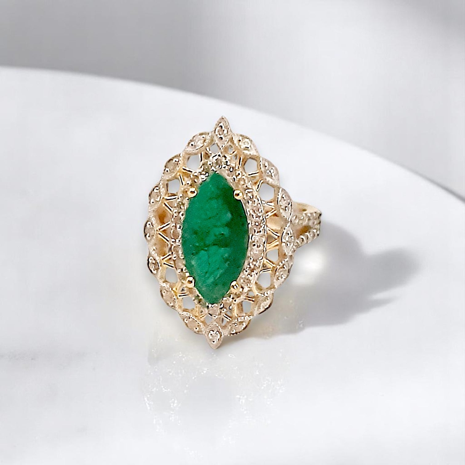 Elevate your elegance with the Queen’s Crest Ring. A bold emerald centerpiece is surrounded by a diamond-encrusted crest design, embodying grace, strength, and royalty in every detail.