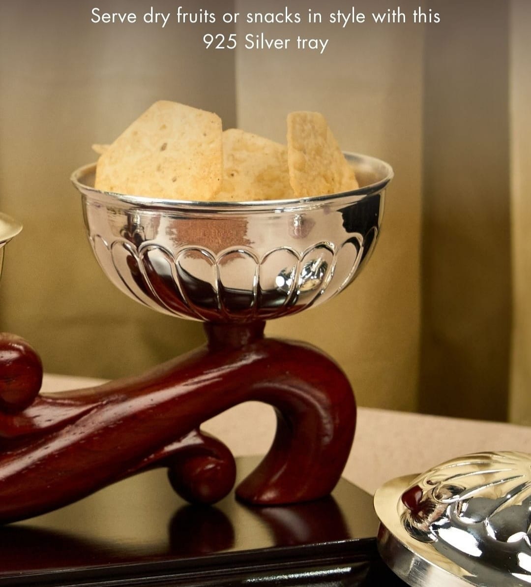 Add elegance to your table with this handcrafted 925 silver snack box, beautifully set on a polished wooden base for a modern yet classic touch. Made from pure 92.5% silver, it features dual bowls with lids—perfect for presenting dry fruits, sweets, or snacks at gatherings and festive occasions.