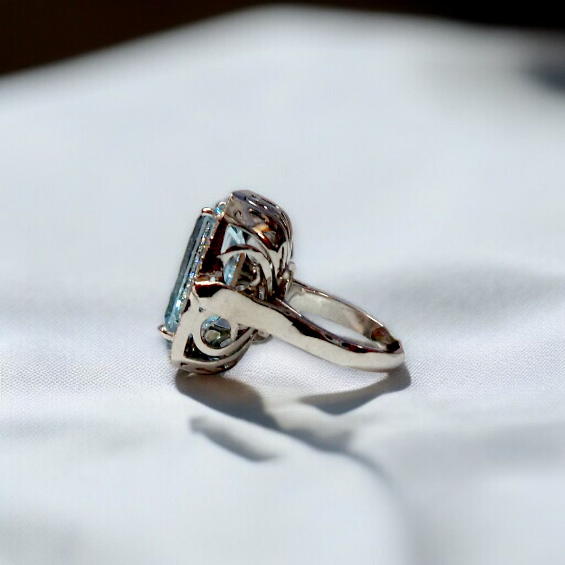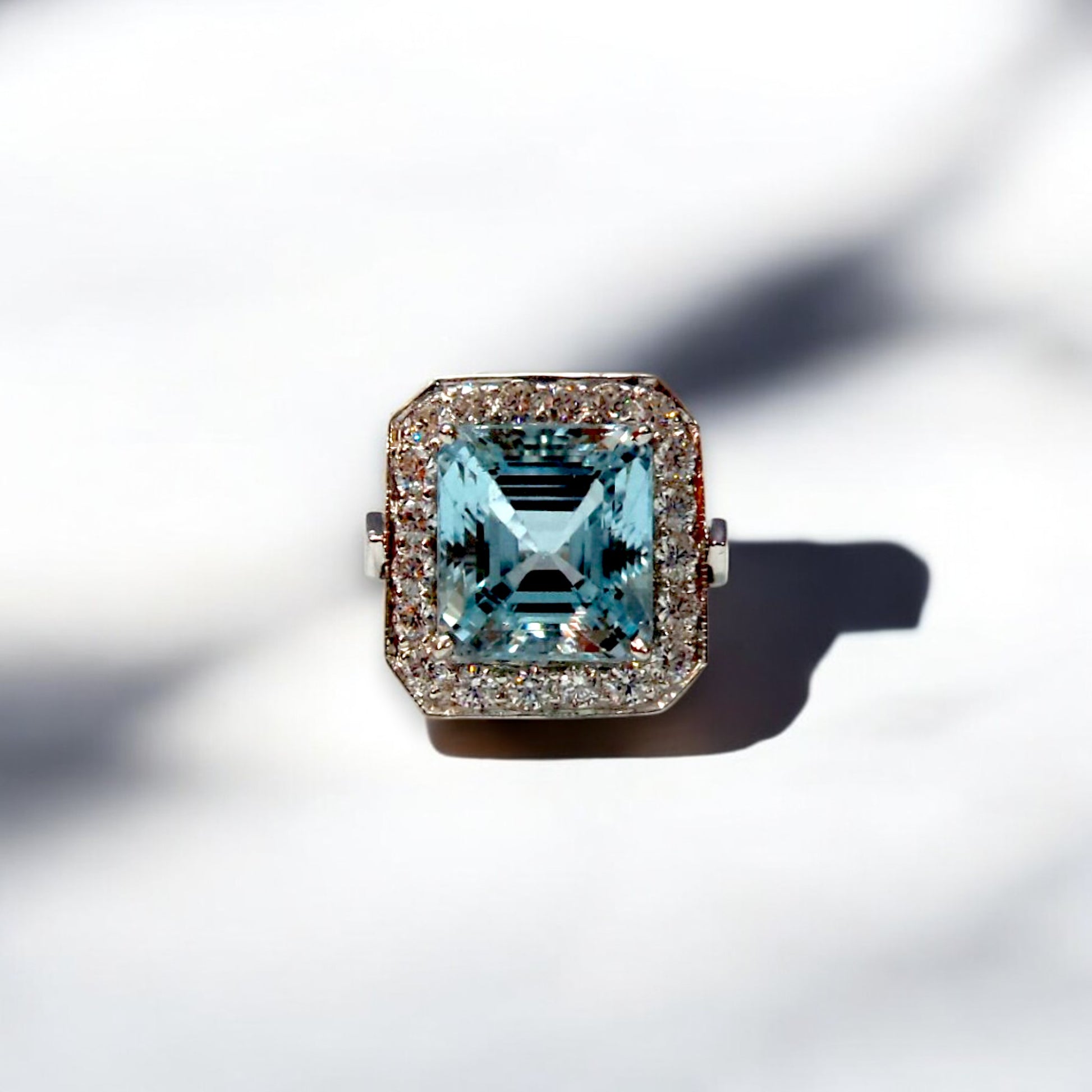 Aqua Blue Topaz Ring. This striking women’s silver ring features a radiant square-cut aqua gemstone, surrounded by a sparkling halo of diamonds. The vibrant blue hue of the central stone catches the light beautifully, making this ring a true statement piece. Set in high-quality silver, the intricate design of the band adds an extra touch of elegance, with delicate detailing that complements the gem's brilliance. Perfect for adding a pop of color to any outfit, this sophisticated ring is ideal for special occasions or as a timeless addition to your jewelry collection. Its blend of classic design and modern flair makes it a standout piece that will always capture attention.