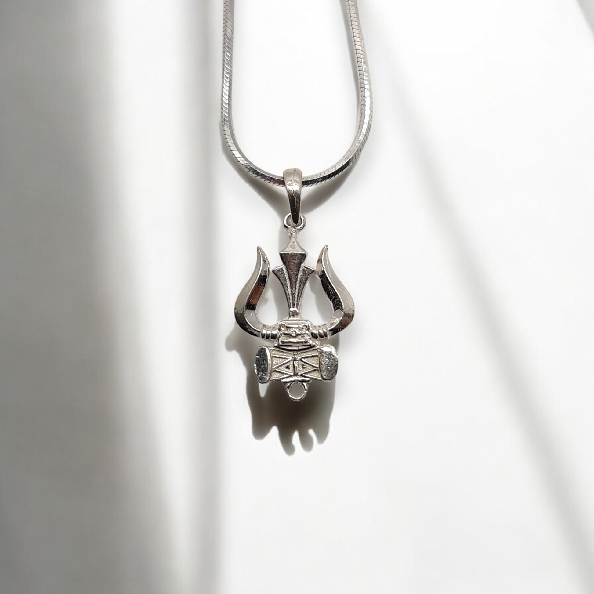 Channel divine energy and cosmic rhythm with the Trishul Damru Shiva Men's Pendant by Khushron Jewels. Expertly cast in 925 sterling silver, this powerful symbol unites the Trishul — representing protection, creation, and destruction — with the Damru, the sacred drum of Lord Shiva that echoes the sound of the universe. A bold spiritual talisman crafted for strength, clarity, and connection with higher consciousness.